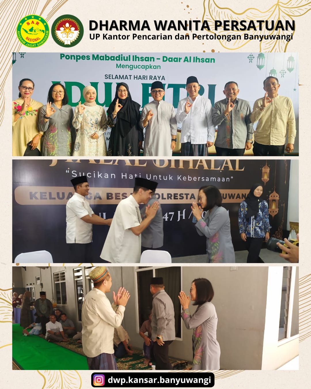 Hari Sabtu, tanggal 21 Maret 2026, Ketua Dharma Wanita Persatuan Unsur Pelaksana Kantor Pencarian dan Pertolongan Banyuwangi melaksanakan Silaturahmi Halal Bihalal Hari Raya Idul Fitri 1447 H ke sejumlah tokoh dan mitra kerja di wilayah Kabupaten Banyuwangi. Kegiatan silaturahmi diawali dengan kunjungan ke Bapak Abdullah Azwar Anas bersama Ibu Bupati Banyuwangi di Pondok Pesantren Mabadiul Ihsan. Dilanjutkan silaturahmi ke Komandan Pangkalan TNI Angkatan Laut (Danlanal) Banyuwangi, serta ke Kepala Kepolisian Resor (Kapolres) Banyuwangi sebagai bentuk sinergitas dan mempererat hubungan kelembagaan. Melalui kegiatan ini, diharapkan dapat semakin mempererat tali silaturahmi, meningkatkan sinergi, serta memperkuat hubungan baik antara Dharma Wanita Persatuan, instansi pemerintah, dan seluruh mitra kerja dalam mendukung pelaksanaan tugas-tugas kemanusiaan di bidang pencarian dan pertolongan.