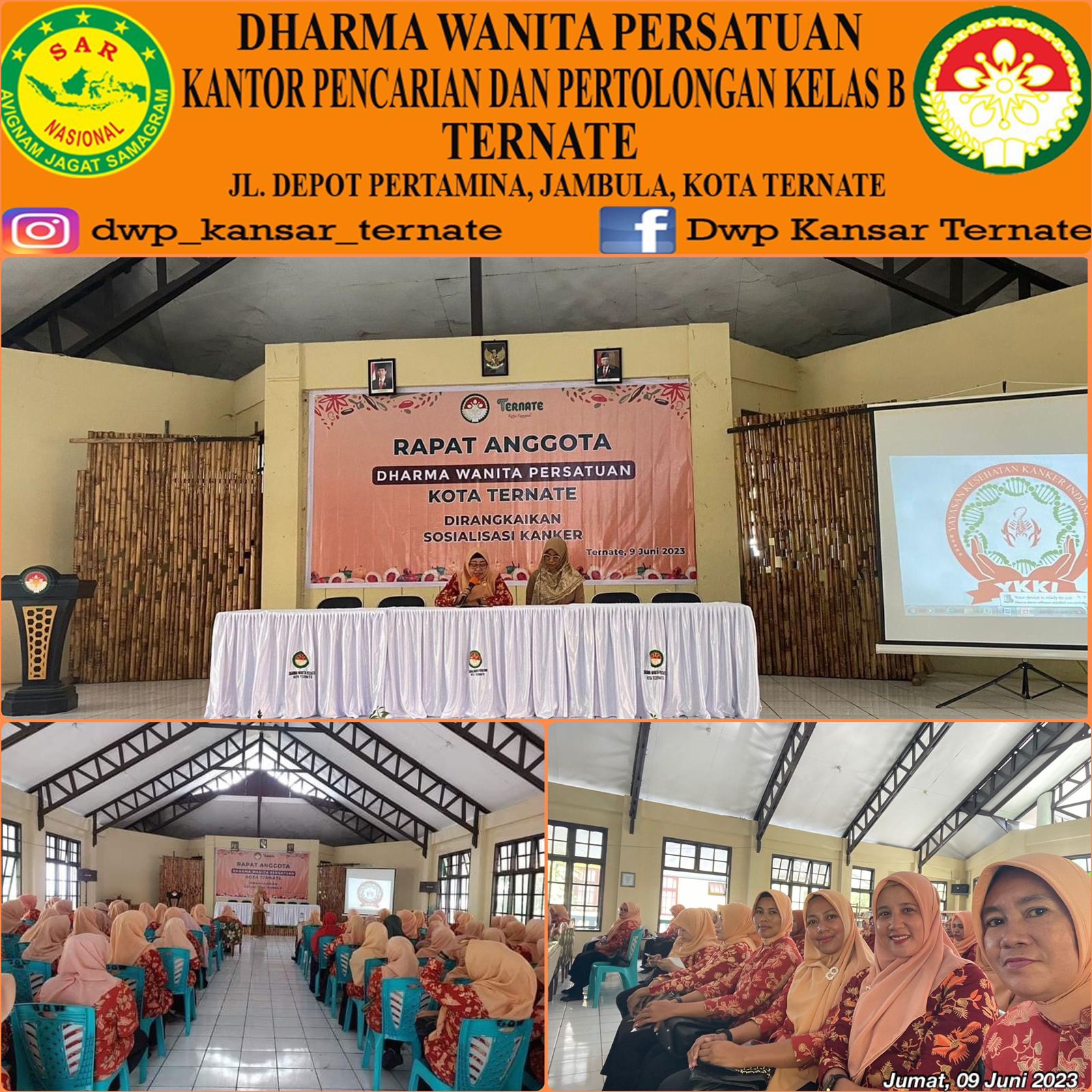 Jumat, 09 Juni 2023 DWP UP. Kantor Pencarian dan Pertolongan Ternate mengikuti Rapat Rutin anggota Dharma Wanita Persatuan Kota Ternate, yang dirangkaikan dengan "Sosialisasi Kanker", bertempat di Aula Gedung Wanita Kota Ternate. diikuti oleh 4 orang anggota.