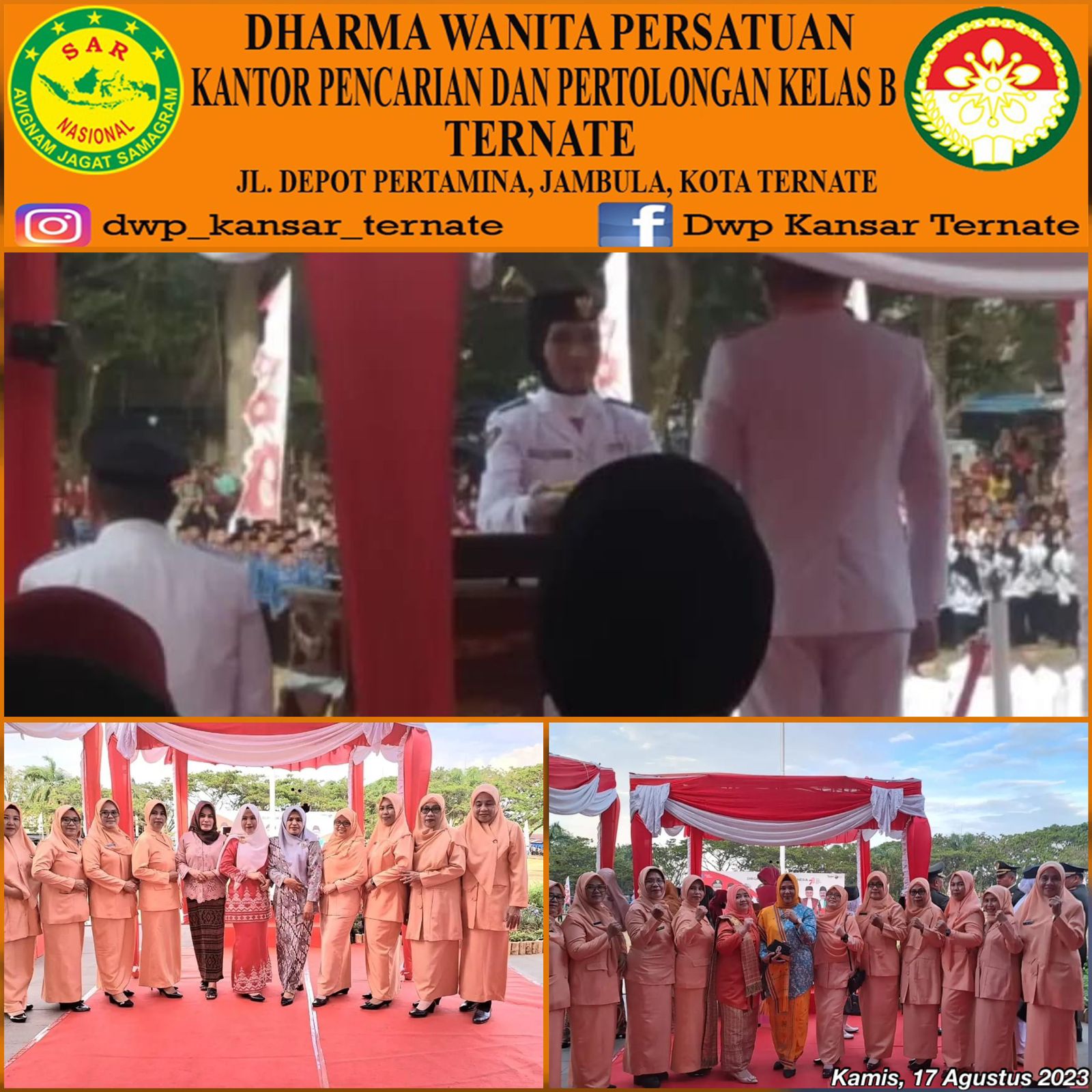 Kamis, 17 Agustus 2023 DWP UP. Kantor Pencarian dan Pertolongan Ternate yang mana diwakili oleh Ibu Armawati Halidin mengikuti Upacara Penurunan Bendera HUT Kemerdekaan Republik Indonesia yang ke 78, bertempat di Lapangan Sunyie Lamo Salero.