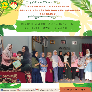 Jumat, 1 Desember 2023 Pengurus Dharma Wanita Persatuan Unsur Pelaksana Kantor Pencarian dan Pertolongan Bengkulu yang didampingi Ibu Ketua Ny. Rosna Oviana Muslikun membesuk anak dari Anggota DWP Ny. Eka Anju pasca dirawat di Rumah Sakit