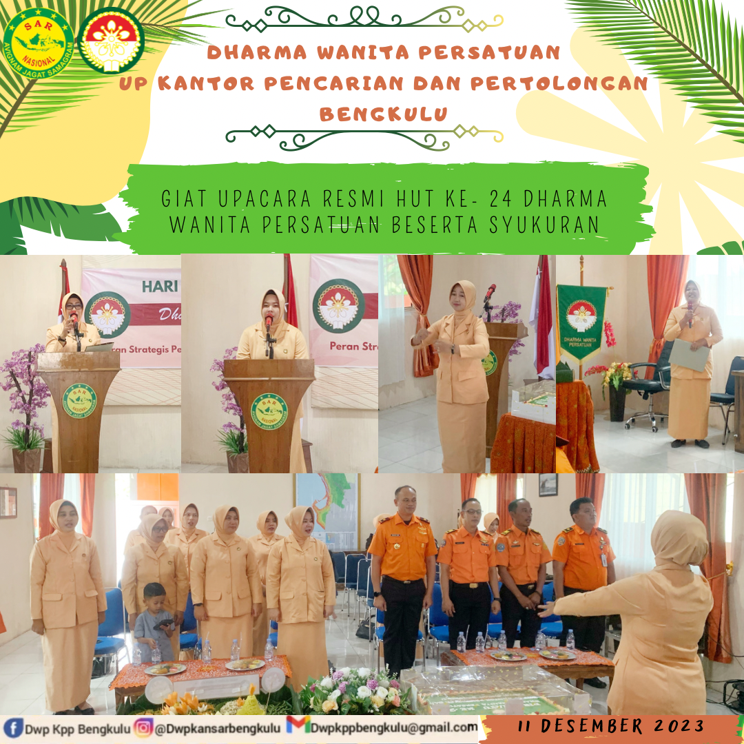 Senin, 11 Desember 2023 Ketua Dharma Wanita Persatuan UP KPP Bengkulu Ny Rosna Muslikun beserta pengurus dan anggota memperingati hari Ulang Tahun dan syukuran Dharma Wanita Persatuan ke 24, bertempat di Aula Kantor Pencarian dan Pertolongan Bengkulu
