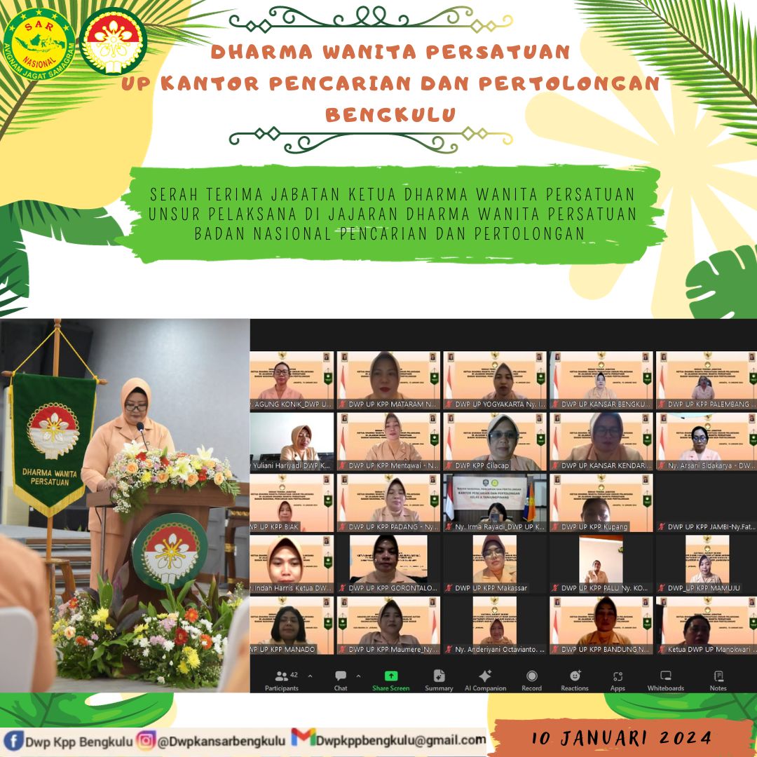 Ketua Dharma Wanita Persatuan Unsur Pelaksana Kantor Pencarian dan Pertolongan Bengkulu Ny. Rosna Muslikun mengikuti acara Serah Terima Jabatan Ketua Dharma Wanita Persatuan Unsur Pelaksana di Jajaran Dharma Wanita Persatuan Badan Nasional Pencarian dan Pertolongan secara online melalui zoom meeting