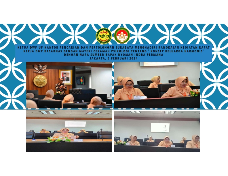 Jakarta 5 Februari 2024 Ketua DWP UP KPP Surabaya Ny. Yuliani Hariyadi menghadiri rangkaian kegiatan rapat kerja DWP Basarnas dengan materi ceramah Psikologi tentang "Konsep keluarga harmonis" dengan narasumber Bapak Nyoman Indra Permana Master of NLP Practitioners bertempat di lantai 2 gedung Basarnas yang dihadiri dan diikuti oleh Pengurus dan 44 Ketua DWP UP Basarnas