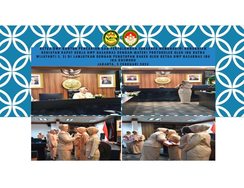 Jakarta, 05 Februari 2024 Ketua DWP Kantor Pencarian dan Pertolongan Surabaya Ibu Yuliani Hariyadi menghadiri rangkaian kegiatan rapat kerja DWP Basarnas dengan materi Protokoler oleh Ibu Ratna Wijayanti S. Si di lanjutkan dengan penutupan raker oleh Ketua DWP Basarnas Ibu Ika Kusworo bertempat di lantai 2 gedung Basarnas di hadiri, di ikuti oleh Pengurus dan 44 Ketua DWP UP Basarnas