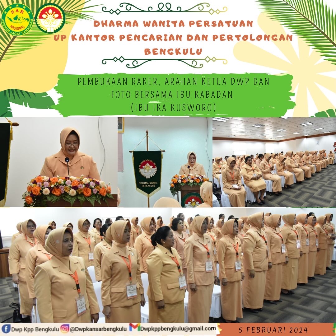 Senin, 05 Februari 2024. Ketua DWP UP KPP Bengkulu, Ny. Rosna Muslikun mengikuti pembukaan rapat kerja, arahan Ketua DWP dan foto bersama Ibu Kabadan (Ibu Ika Kusworo) Ketua Dharma Wanita Persatuan Unsur Pelaksana di jajaran Dharma Wanita Persatuan Badan Nasional Pencarian dan Pertolongan yang diikuti oleh 44 Ketua DWP UP seluruh Indonesia. Bertempat di gedung Basarnas lantai 2