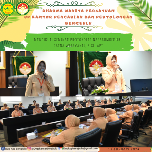 Senin, 5 Februari 2024 Ketua DWP UP KPP Bengkulu Ny. Rosna Muslikun mengikuti seminar Protokoler narasumber Ibu Ratna Wijayanti, S.Si, Apt di Kantor Basarnas Pusat lt 2