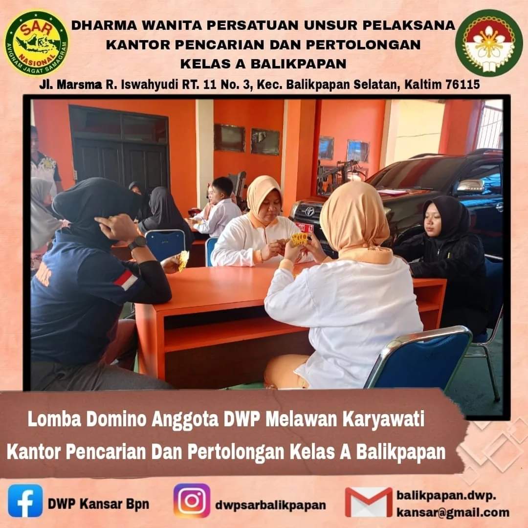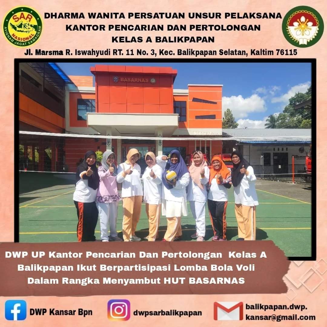 Pad tanggal 21 Februari 2024 DWP UP Kantor Pencarian dan Pertolongan Balikpapan ikut berpartisipasi dalam kegiatan lomba bola volley dan domino dalam rangka HUT Ke-52 Basarnas di Kantor Pencarian dan Pertolongan Balikpapan.