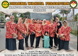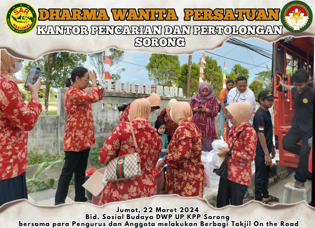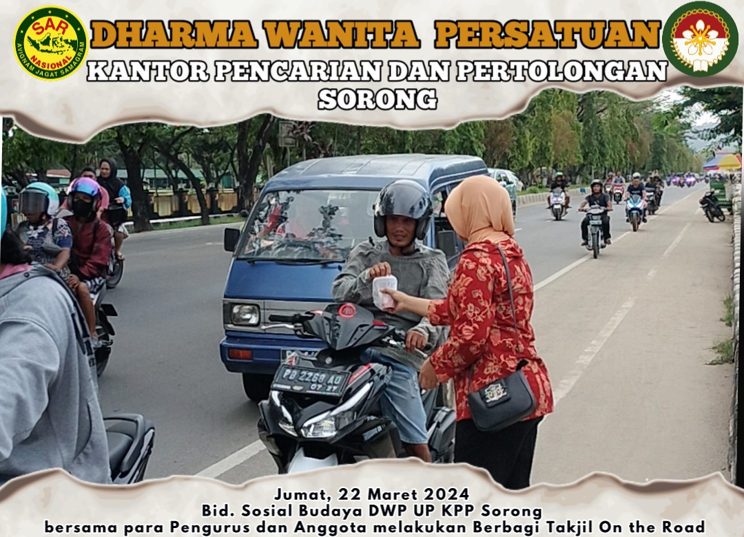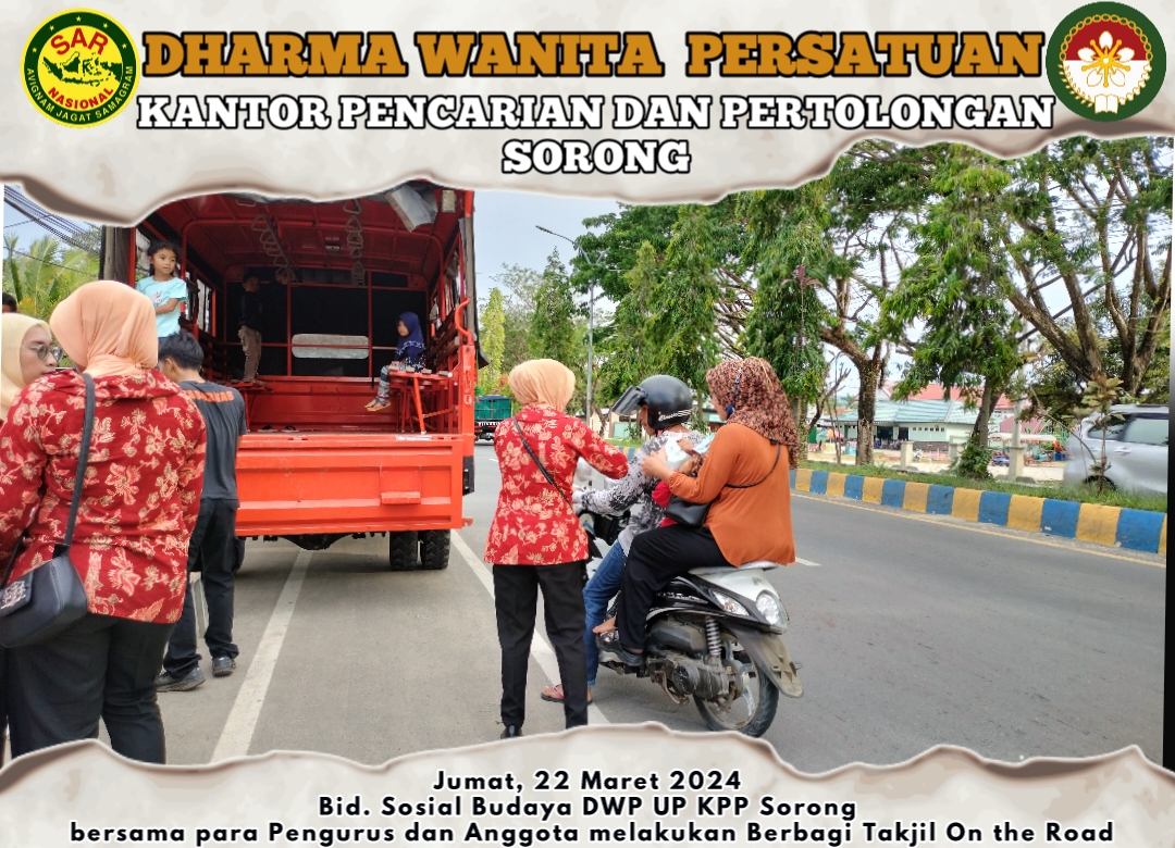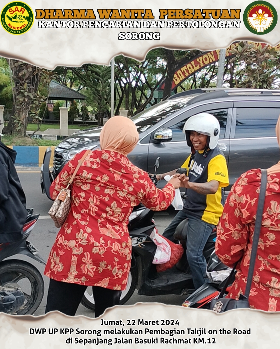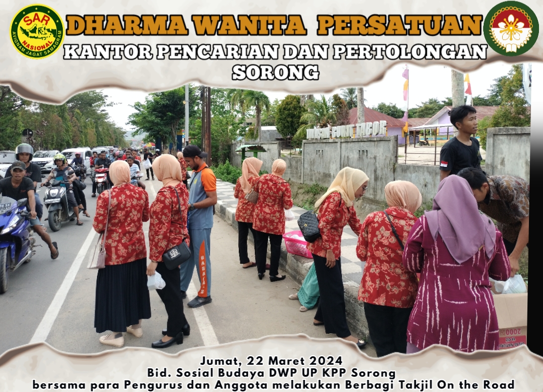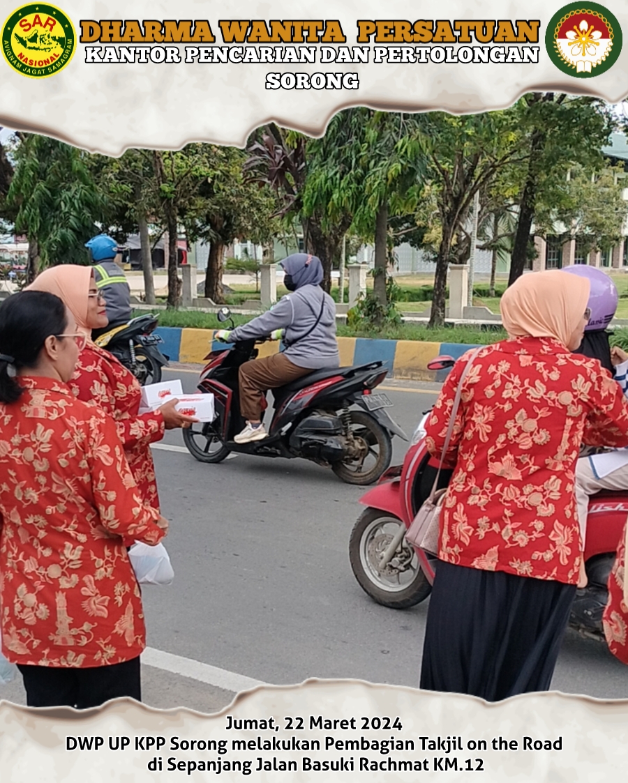 Jumat 22 Maret 2022,Wakil Ketua DWP UP KPP Sorong Ny. Ulama Hendry bersama beberapa Pengurus dan Anggota melaksanakan Kegiatan Pembagian Takjil di Minggu Kedua Bulan Ramadhan kepada masyarakat yang melintas di jalan Utama Basuki Rachmat KM. 12 Depan Batalyon. Kegiatan di ikuti oleh 10 Anggota dan beberapa Pegawai Kantor Pencarian Dan Pertolongan Sorong.
