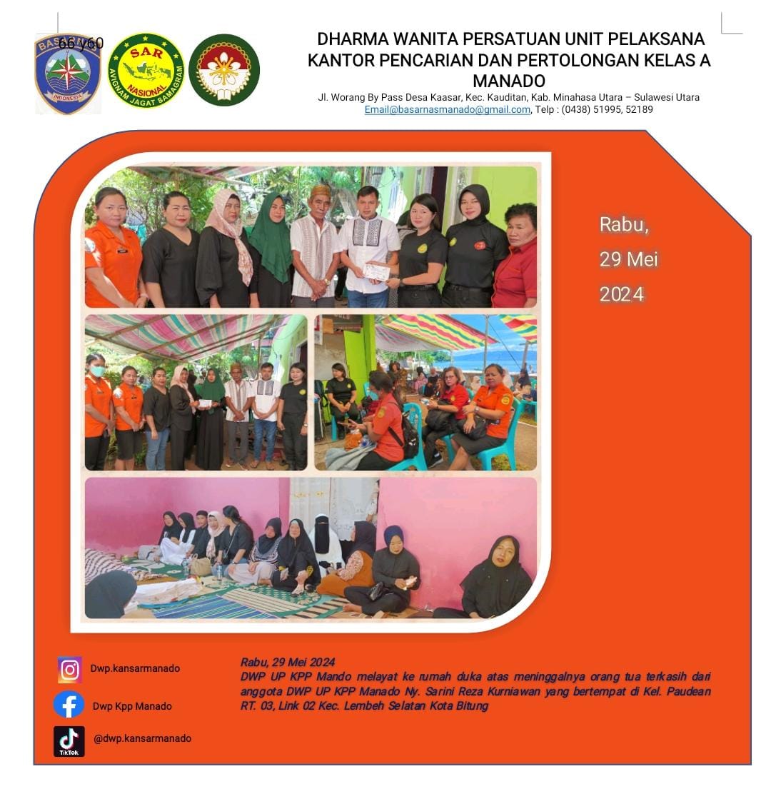 Rabu, 29 Mei 2024 DWP UP KPP Manado melayat ke rumah duka atas meninggalnya orang tua terkasih dari anggota DWP KPP Manado Ny. Sarini Reza Kuriawan yang bertempat di Kel.Paudean RT 03, Link.02 Kec.Lembeh Selatan Kota Bitung