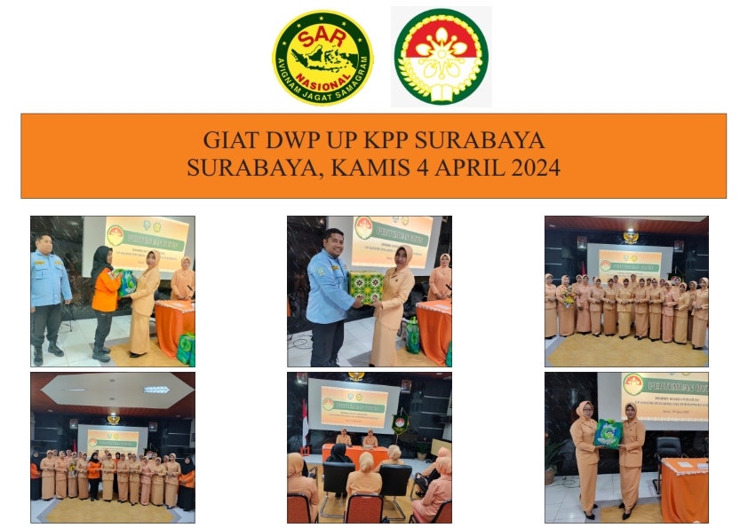 Ketua Dharma Wanita UP Kantor Pencarian dan Pertolongan Surabaya Ny. Yuliani Hariyadi beserta pengurus dan anggota melaksanakan pertemuan rutin sekaligus membagikan bingkisan lebaran kepada Pegawai dan Anggota DWP UP KPP Surabaya yang dilaksanakan di ruang briefing KPP Surabaya pada hari Kamis, 4 April 2024
