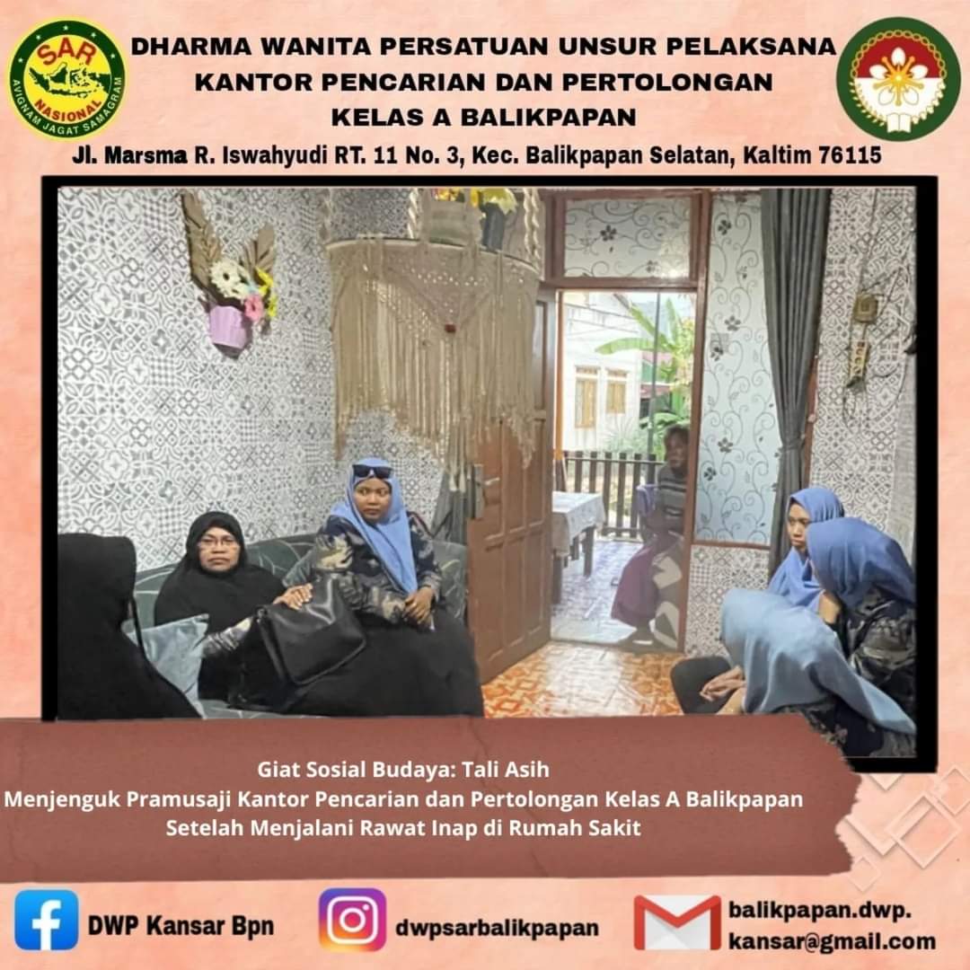 Kamis, 17 Oktober 2024 Ketua UP DWP Kantor Pencarian dan Pertolongan Kelas A Balikpapan mengunjungi pramubakti Kantor Pencarian dan Pertolongan Kelas A Balikpapan yang sakit terkena stroke.