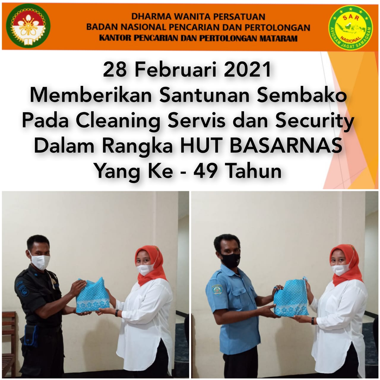 Dalam Rangka HUT Basarnas ke-49 Ketua UP DWP Kantor Pencarian dan Pertolongan Mataram menyerahkan Santunan berupa Sembako kepada Security dan Cleaning Service Pos Pencarian dan Pertolongan Bima