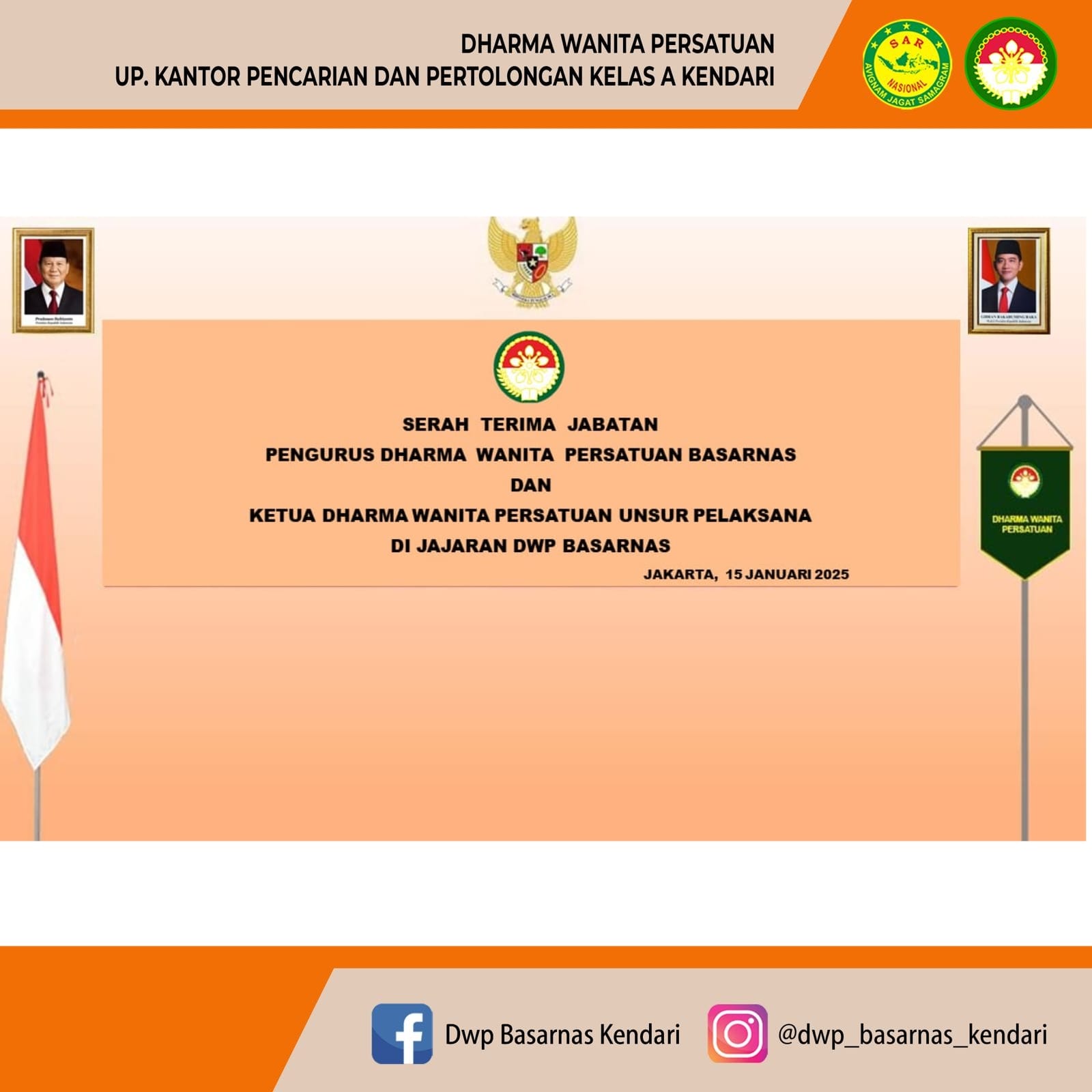 Ketua DWP UP Kantor Pencarian dan Pertolongan Kendari Ny.Yenny Sutisna Amiruddin mengikuti acara Serah Terima Jabatan Pengurus Dharma Wanita Persatuan dan Ketua Dharma Wanita Persatuan Unsur Pelaksana di Jajaran DWP Basarnas. Kegiatan Berlangsung melalui Virtual Zoom