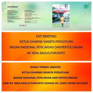 Exit briefing Ketua Dharma Wanita Persatuan Badan Nasional Pencarian dan Pertolongan Ny. Rina Bagus Puruhito yang dilaksanakan secara virtual pada tanggal 3 Februari 2021, kemudian dilanjutkan serah terima jabatan Ketua Dharma Wanita Persatuan Badan Nasional Pencarian dan Pertolongan dari Ny. Rina Bagus Puruhito kepada Ny. Santi Henri Alfiandi yang juga dilaksanakan secara virtual.