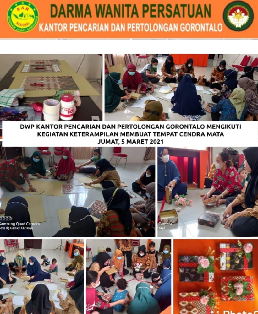 Jumat, 5 Maret 2021 Kegiatan DWP Kantor Pencarian dan Pertolongan (BASARNAS) Gorontalo : Dharma Wanita Persatuan Kantor Pencarian dan Pertolongan Gorontalo mengikuti kegiatan keterampilan membuat tempat Cendra Mata