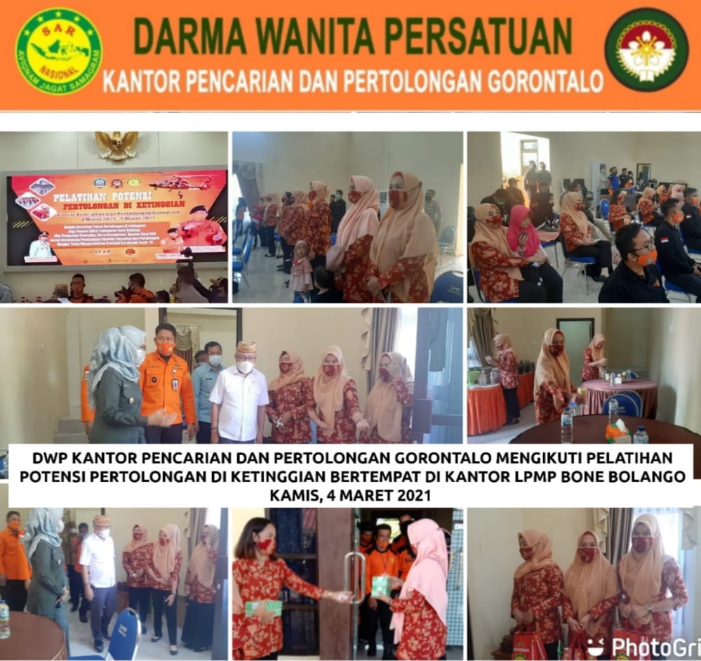 Kamis, 4 Maret 2021 Kegiatan DWP Kantor Pencarian dan Pertolongan (BASARNAS) Gorontalo : Dharma Wanita Persatuan Kantor Pencarian dan Pertolongan Gorontalo mengikuti Pelatihan Potensi Pertolongan di ketinggian bertempat di Kantor LPMP Bone Bolango