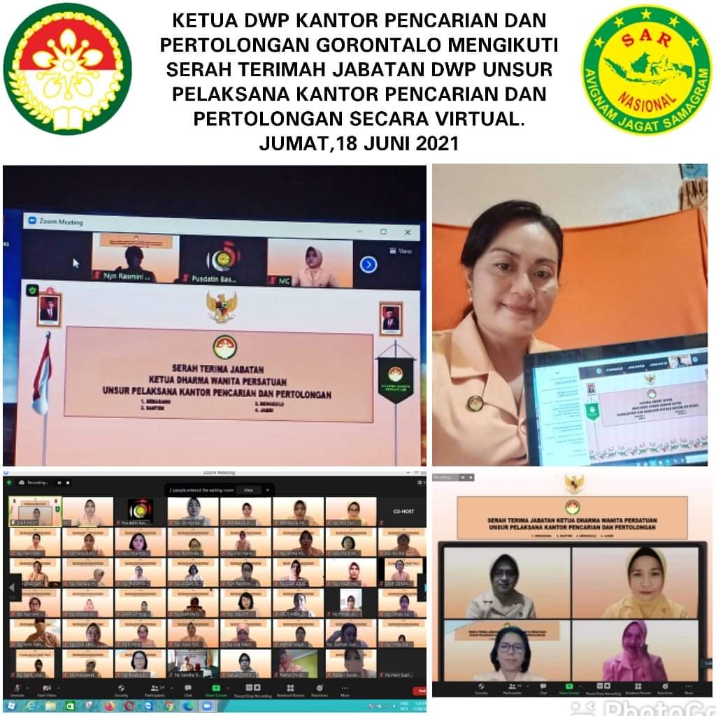 Jumat, 18 Juni 2021 Kegiatan DWP KPP Gorontalo : Ketua DWP Kantor Pencarian dan Pertolongan Gorontalo mengikuti Serah Terimah Jabatan DWP Unsur Pelaksana Kantor Pencarian dan Pertolongan secara Virtual.