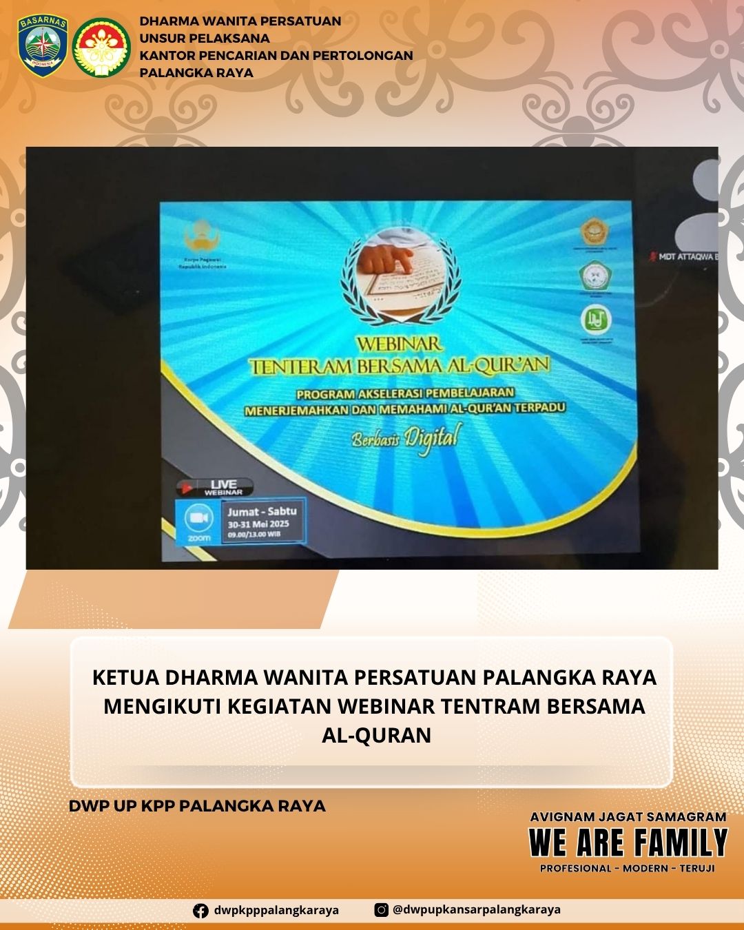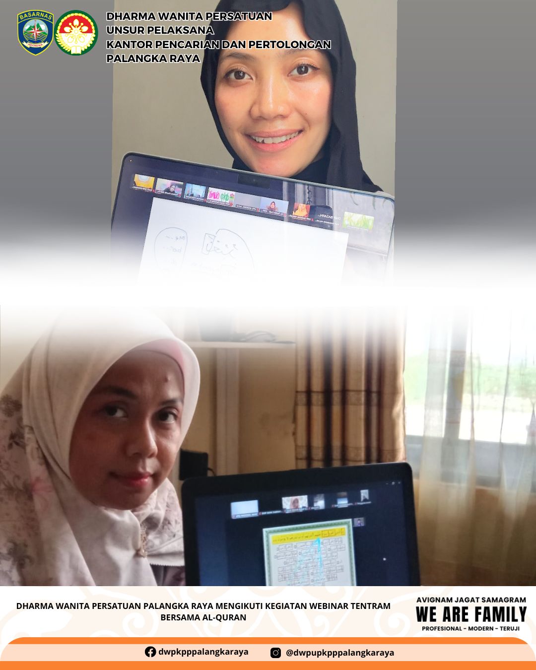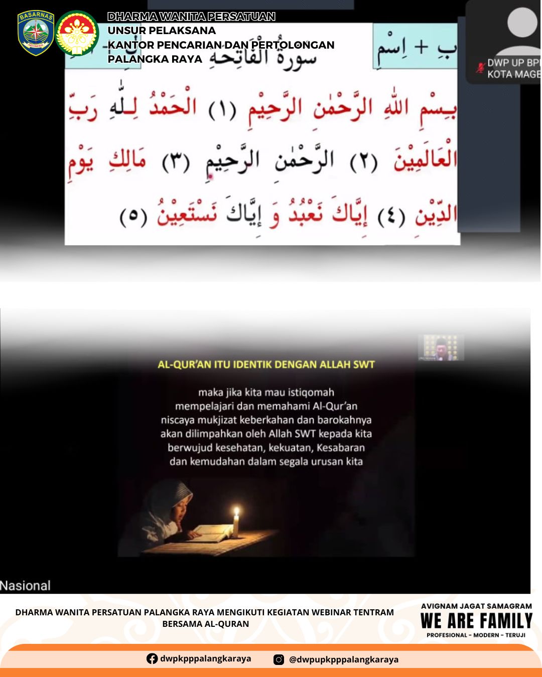 Dharma Wanita Persatuan Unsur Pelaksana Kantor Pencarian Dan Pertolongan Palangka Raya,Pengurus dan Anggota,Mengikuti Undangan Webinar dengan tema "Tentram Bersama Al-Quran" dalam program Akselerasi Pembelajaran Menerjemah dan Memahami Al-Quran Berbasis Digital.