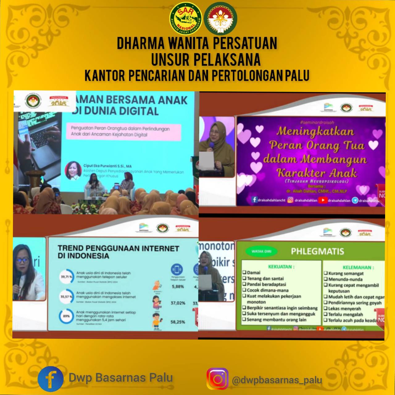 Giat. Rabu 4 Juni 2025. Dharma Wanita Persatuan Unsur Pelaksana Kantor Pencarian dan Pertolongan Palu mengikuti kegiatan Talkshow yang diselenggarakan oleh DWP PPN BAPPENAS secara online melalui live streaming YouTube dengan tema: " Meningkatkan Peran Orang Tua Dalam Hubungan Karakter Anak yang Berdaya Saing dan Berintegritas Pada Era Digital Untuk Mewujudkan Manusia Berkualitas Menuju Indonesia Emas". dengan Narasumber Dr. Aisyah Dahlah CMHI.,CM.MlP dan Ciput Eka Putwianti.