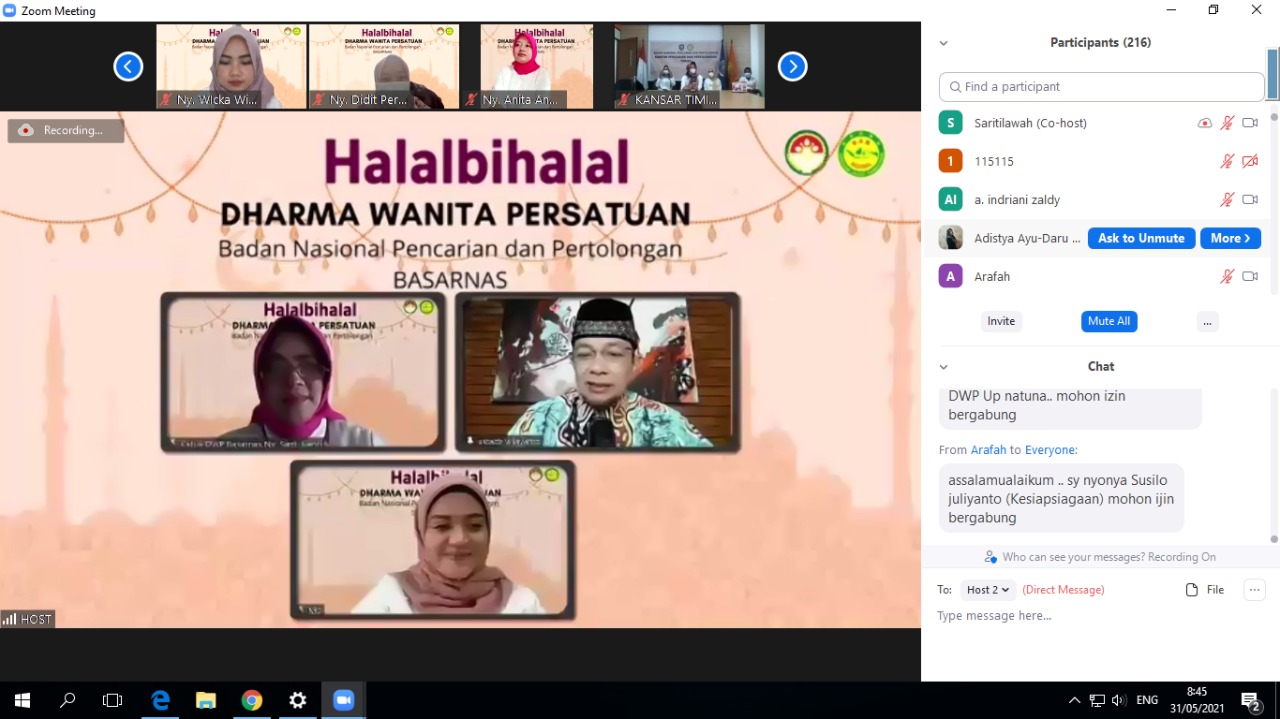 Pada tanggal 31 Mei 2021, DWP Basarnas mengadakan Pengajian dan Halal bi Halal virtual dengan pencermah : Ustadz Wijayanto diikuti oleh Anggota DWP Basarnas dan anggota DWP UP di Jajaran DWP Basarnas.