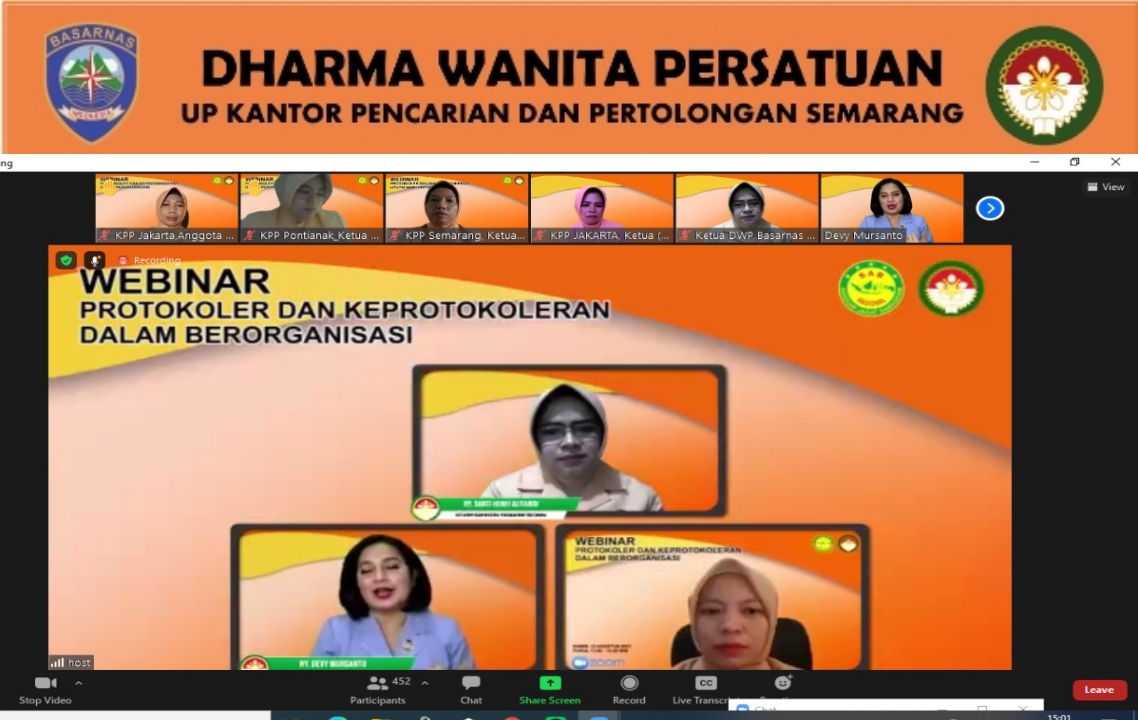 Kamis, 12 Agustus 2021. Dwp UP KPP Semarang mengikuti giat Webinar Protokoler dan Keprotokoleran Dalam Berorganisasi yang diadakan oleh DWP Badan Nasional Pencarian dan Pertolongan Pusat secara virtual melalui zoom meeting, oleh pemateri Ny. Devi Mursanto. Diikuti oleh ibu ketua beserta beberapa pengurus DWP UP KPP Semarang