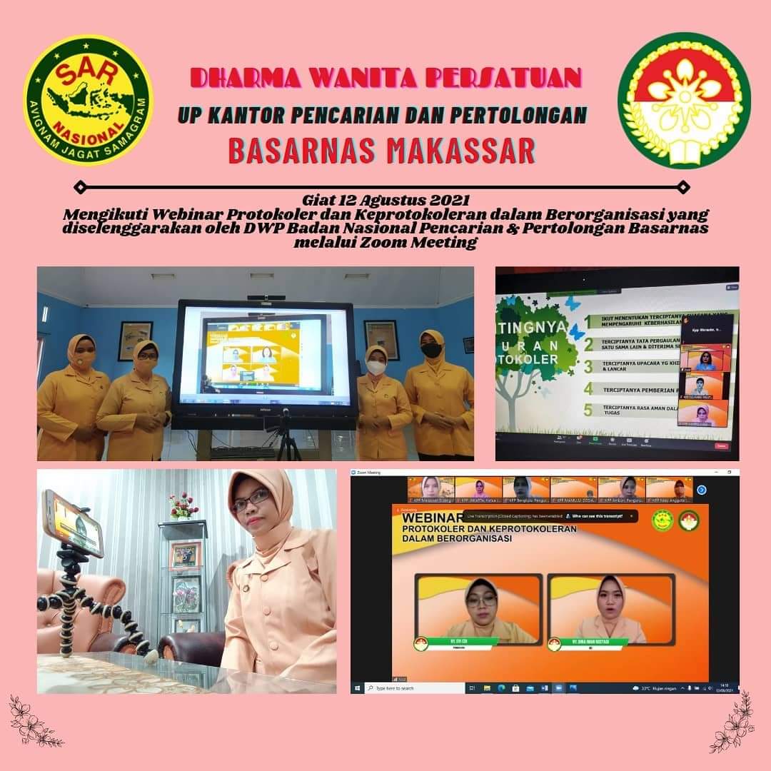 [14.08, 18/8/2021] YuyunDarul: Ketua DWP UP KPP Basarnas Makassar Ny. Hasnawati Djunaidi beserta Pengurus dan Anggota Mengikuti Webinar Protokoler dan Keprotokoleran dalam Berorganisasi (Narasumber: Ny. Devy Mursanto) yang diselenggarakan oleh DWP Badan Nasional Pencarian & Pertolongan Basarnas melalui Zoom Meeting. Adapun peserta Webinar, yaitu: 1. Ny. Hasnawati Djunaidi 2. Ny. Ami Budi 3. Ny. Yuyun Darul 4. Ny. Rina Asyikin 5. Ny. Lisa Arhamdiansyah 6. Ny. Asni Muh. Agus 7. Ny. Nita Artanto 8. Ny. Rezky Nurfajri