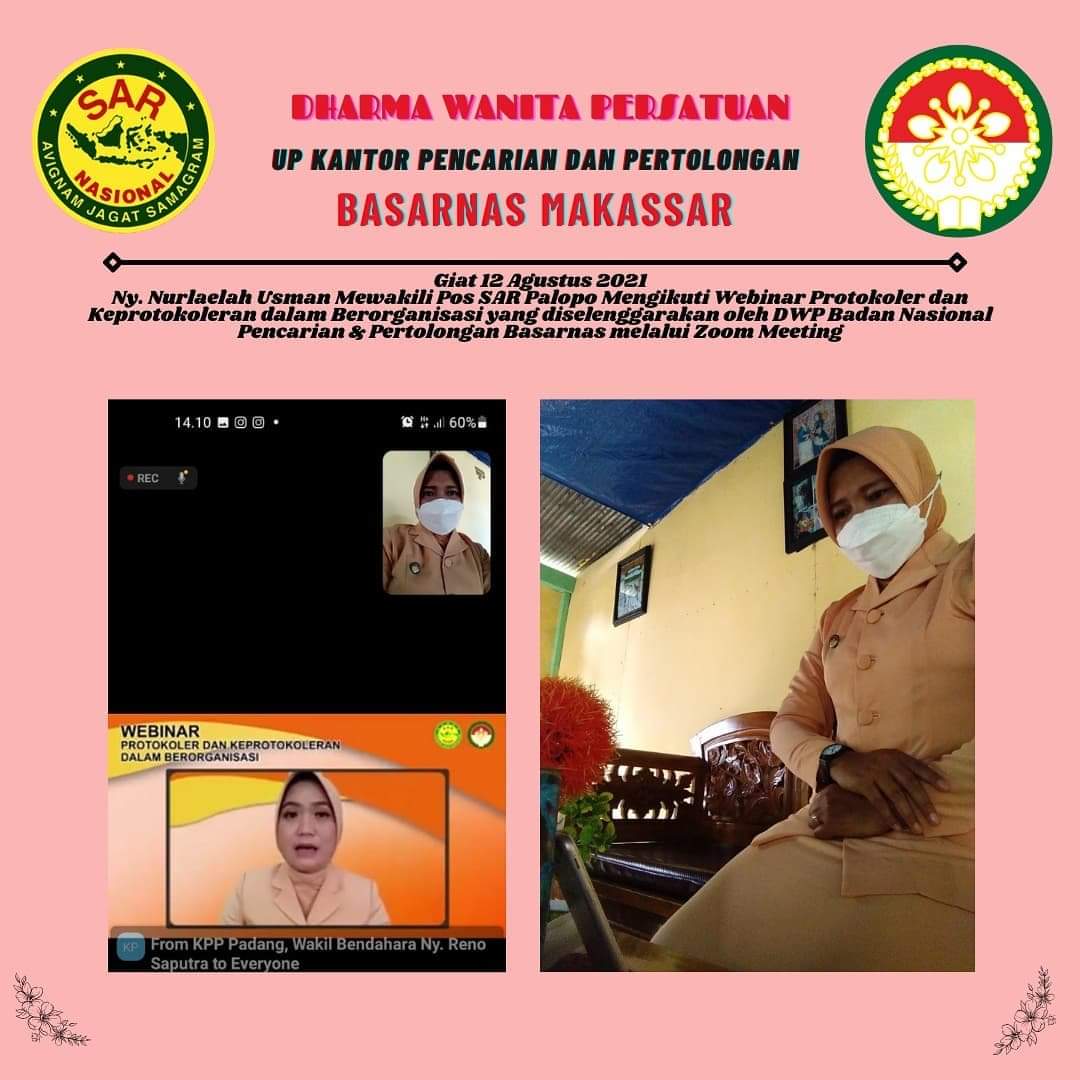 Ny. Nurlaelah Usman Mewakili DWP Pos SAR Palopo Mengikuti Webinar Protokoler dan Keprotokoleran dalam Berorganisasi (Narasumber: Ny. Devy Mursanto) yang diselenggarakan oleh DWP Badan Nasional Pencarian & Pertolongan Basarnas melalui Zoom Meeting