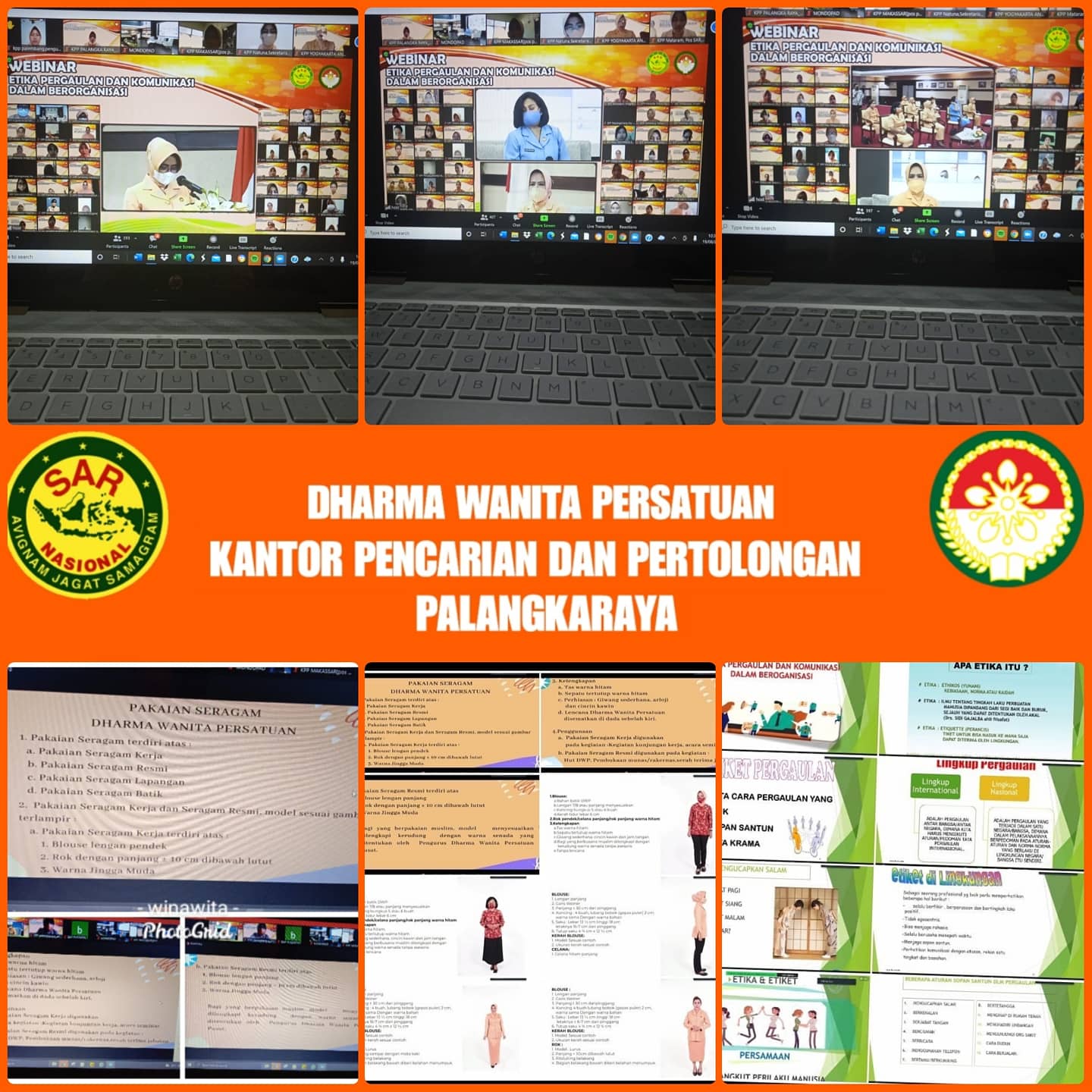 Giat Dharma Wanita Persatuan Unsur Pelaksana Kantor Pencarian dan Pertolongan Palangka Raya mengikuti Webinar yang di selenggarakan oleh Dharma Wanita Persatuan Basarnas dengan tema "Etika Pergaulan dan komunikasi dalam Berorganisasi" yang di ikuti oleh semua Unsur Pelaksana Kantor Pencarian dan Pertolongan Seluruh Indonesia yang di lakukan secara virtual