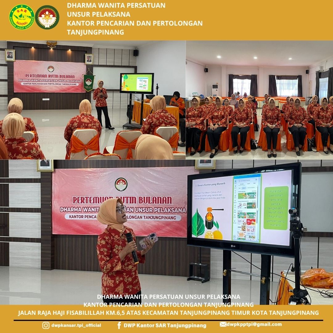 Hari Minggu,Tanggal 06 Juli 2025, DWP UP KPP Tanjungpinang Melaksanakan Pertemuan Rutin Bulanan yang diisi dengan Sosialisasi Pemasaran Produk Jualan Melalui Aplikasi Canva oleh Bidang Ekonomi, di Aula Kantor Pencarian dan Pertolongan Tanjungpinang.