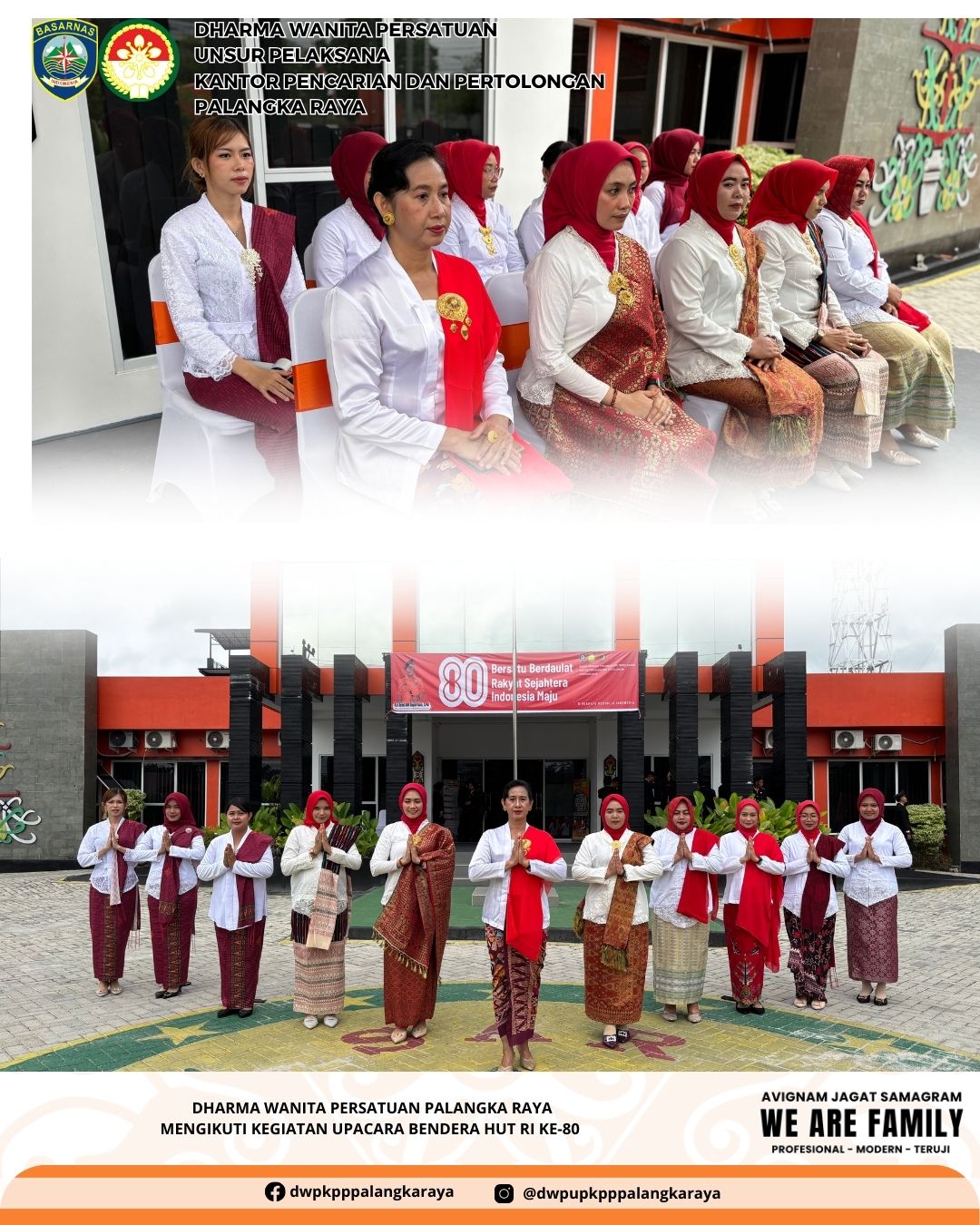 Palangka Raya-----Minggu 17 Agustus 2025 Ketua Dharma Wanita Persatuan Unsur Pelaksana Kantor Pencarian dan Pertolongan Palangka Raya, Ny. Anak Agung Konik Alit Supartana,Pengurus beserta Anggota Mengikuti Kegiatan Upacara Bendera HUT RI KE-80 thn yang diselenggarakan dihalaman kantor Pencarian dan Pertolongan Palangka Raya Kegiatan ini berlangsung khidmat dengan diikuti oleh seluruh Pegawai Kantor Pencarian dan Pertolongan Palangka Raya.
