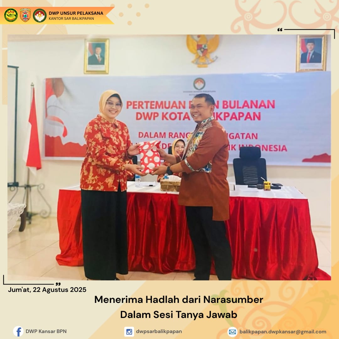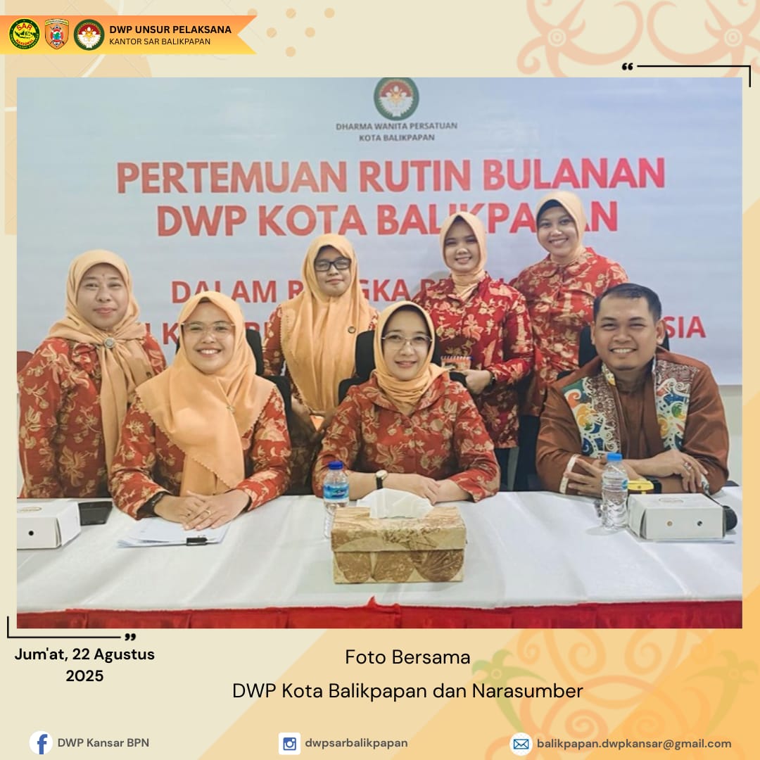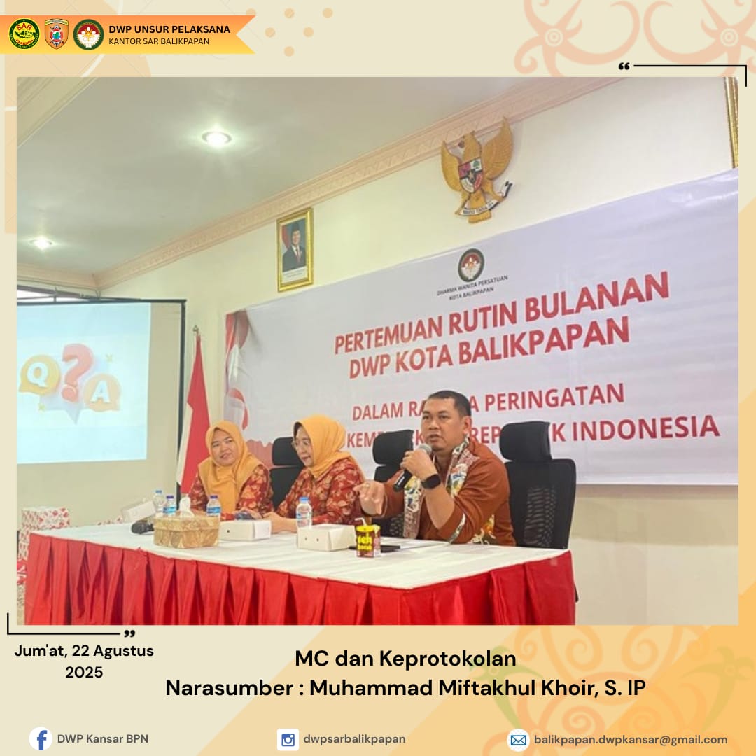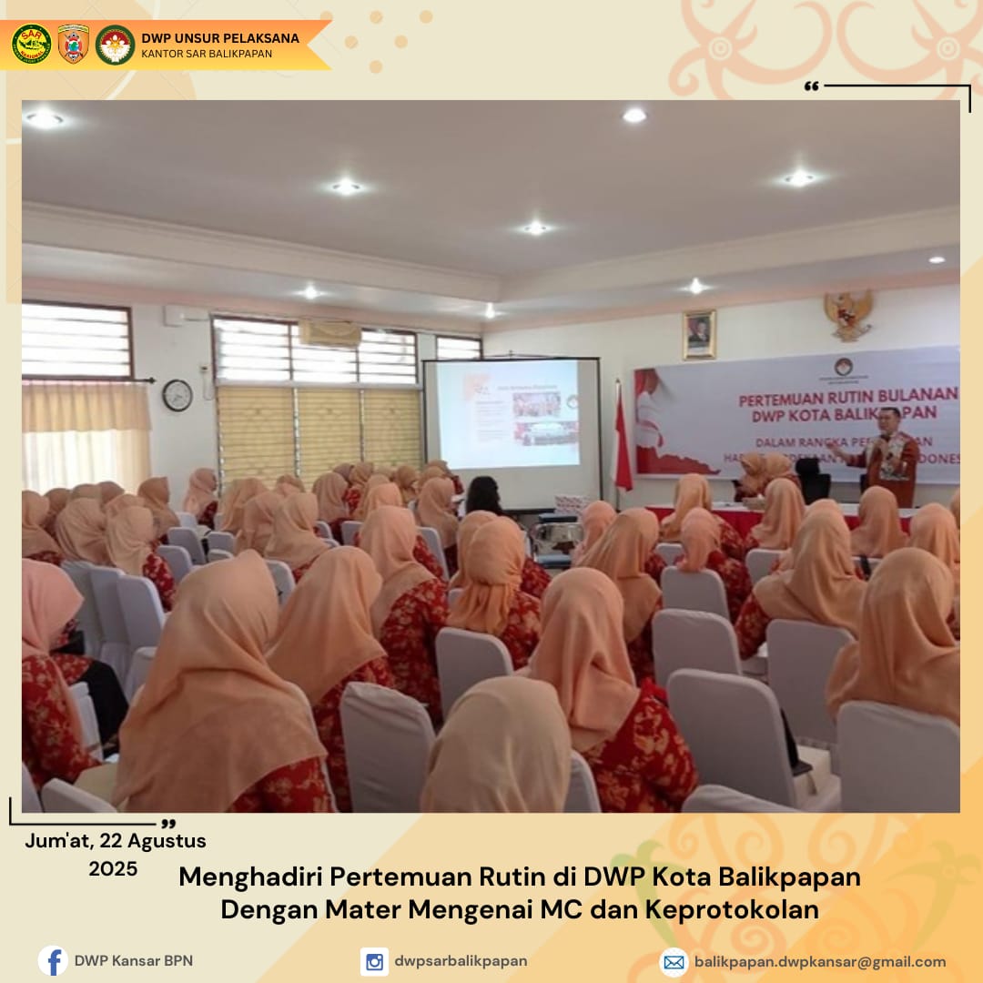 Jumat, 22 Agustus 2025, DWP UP Kantor Pencarian dan Pertolongan Balikpapan menghadiri pertemuan rutin yang diselenggarakan oleh DWP Kota Balikpapan. Pertemuan ini diwakili oleh Ny. Neti Anton Kurniawan dan Ny. Nesa Himalaya. Kegiatan yang dilaksanakan dalam pertemuan ini adalah Pelatihan Protokol dan MC, dengan narasumber Muhammad Miftakhul Khair, S.IP. Pertemuan ini bertujuan untuk meningkatkan kemampuan dan pengetahuan anggota DWP dalam mengelola acara dan menjalankan protokol dengan baik.