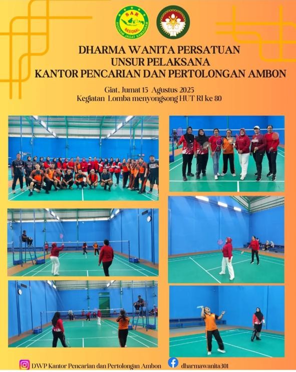 Ambon, 15 Agustus 2025, Ketua Dharmawanita Kantor Pencarian dan Pertolongan Ambon Ny, Maryam Arafah bersama Anggota mengikuti Kegiatan Lomba Olahraga Badminton dalam rangka menyongsong Peringatan HUT RI.