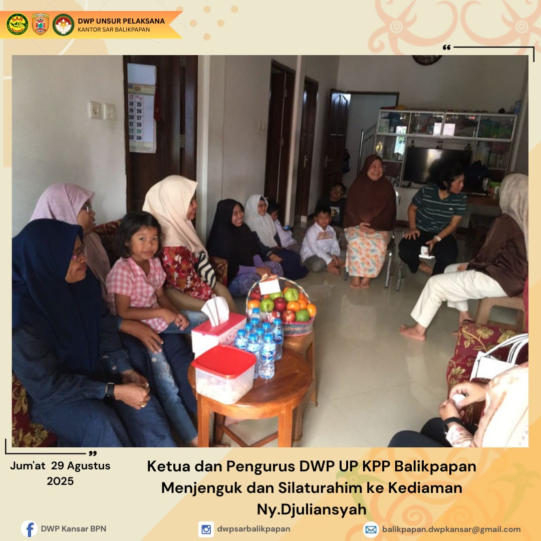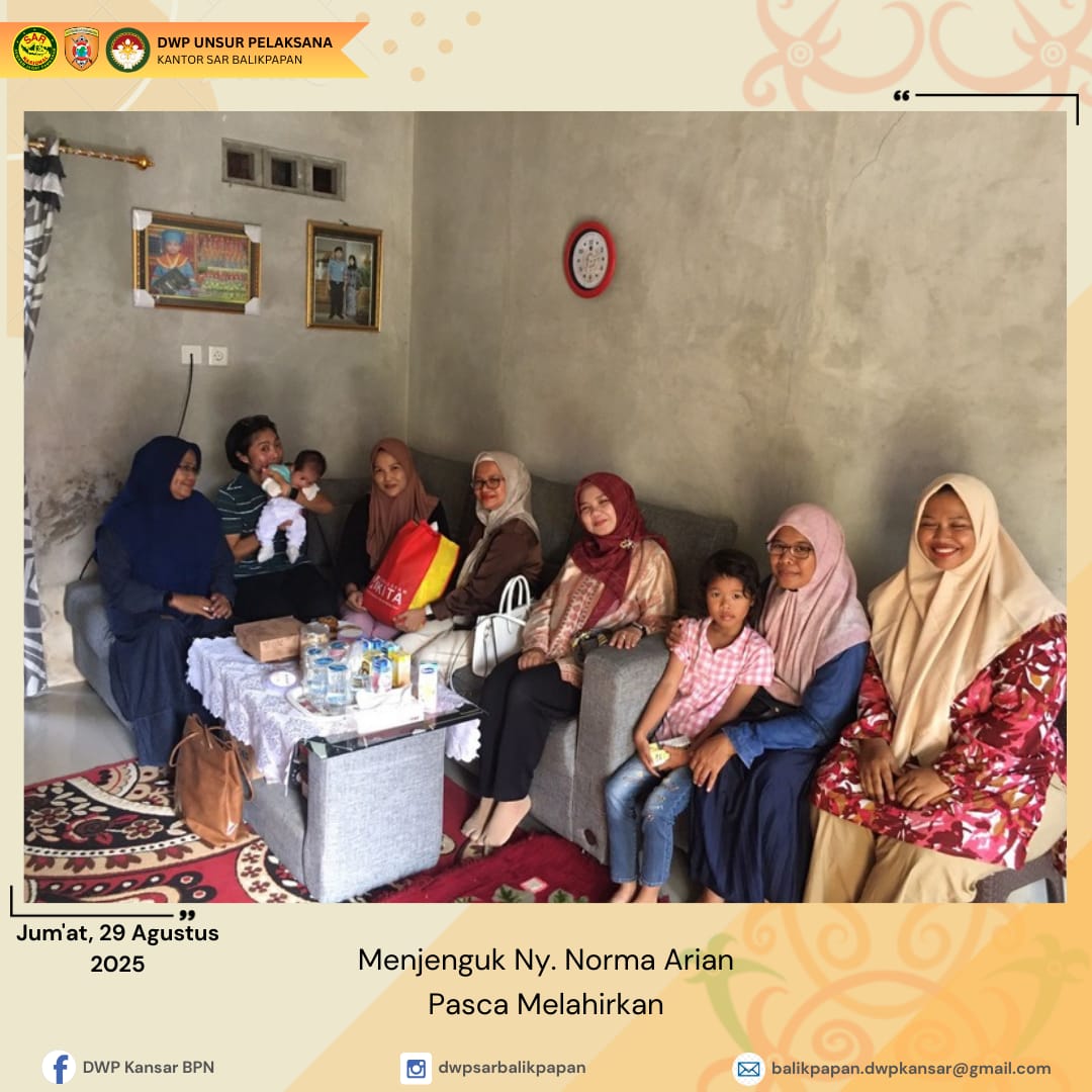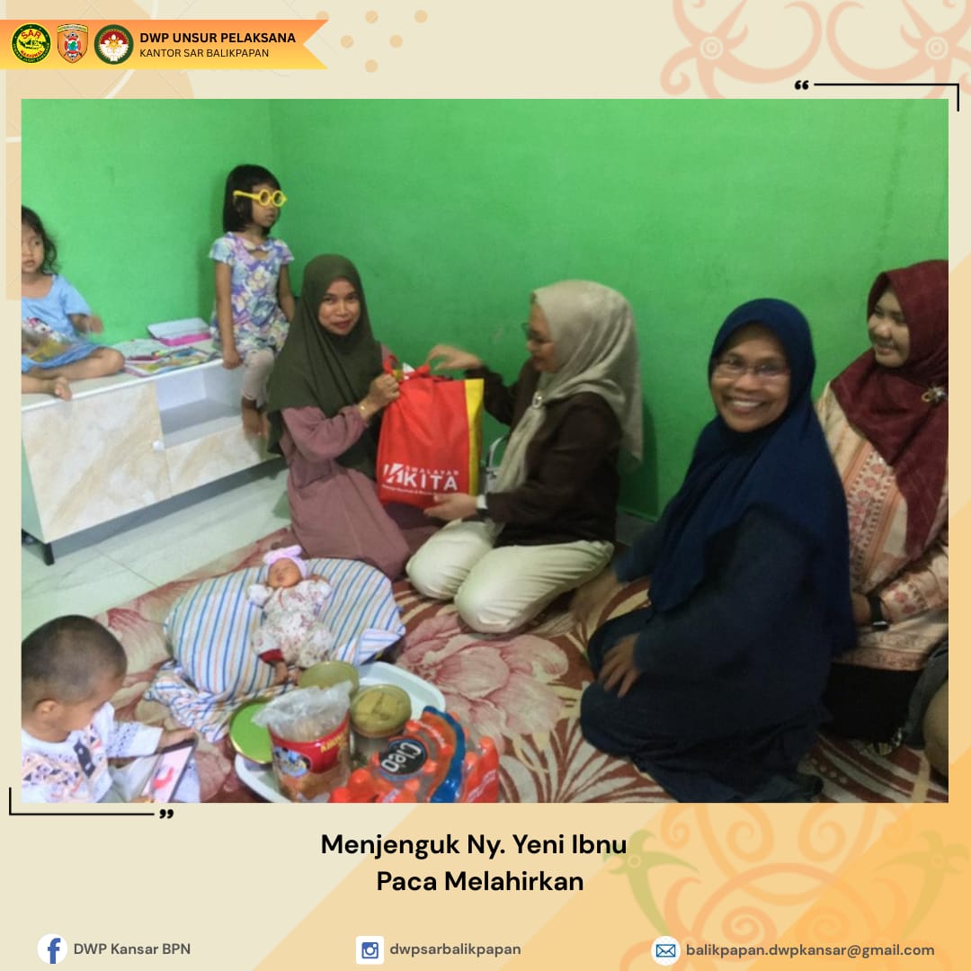 Jumat 29 Agustus 2025, Ketua DWP UP Kantor Pencarian dan Pertolongan Balikpapan Ny. Indah Dody Setiawan beserta pengurus bidang sosial budaya menunjukkan kepedulian dan kasih sayang menjenguk anggota yang melahirkan serta mengunjungi orangtua pegawai yang sakit. Kunjungan dilakukan kepada Ny. Yeni Ibnu yang melahirkan anak ke-3, kunjungan kepada Ny. Norma Arian yang melahirkan anak ke-2, kunjungan kepada ayahanda Ny. Winda Djuliansyah yang mengalami kecelakaan motor, dan kunjungan kepada ibunda Ny. Indriana Andik Wibowo yang sedang opname di Rumah Sakit. Kegiatan ini sebagai bentuk silaturahmi dan kepedulian kepada keluarga besar Kantor Pencarian dan Pertolongan Balikpapan.