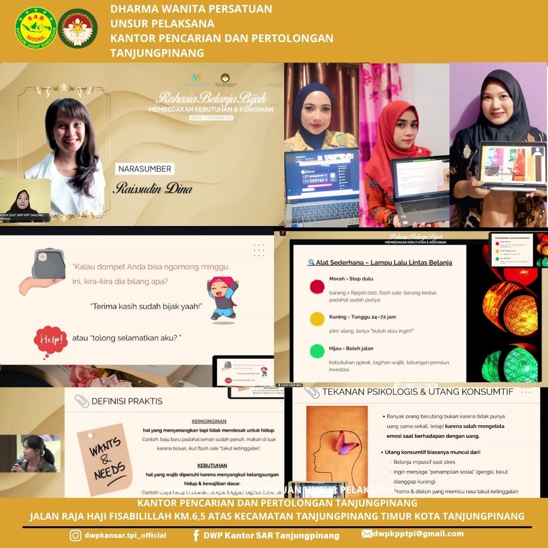 Kamis, 11 September 2025,Ketua Dharma Wanita Persatuan Unsur Pelaksana Kantor Pencarian dan Pertolongan Tanjungpinang, Ny. Pipit Fazzli dan Pengurus Mengikuti Pertemuan Rutin DWP BPS Yang Diisi Talkshow dengan Narasumber Ibu Raissudin Dina Mengusung Tema "Rahasia Belanja Bijak, Membedakan Kebutuhan Dan Keinginan"