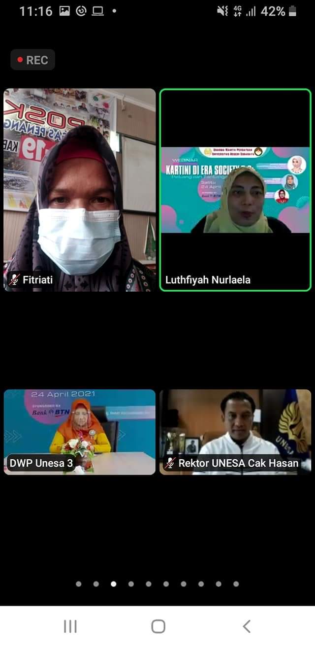 Ibu ketua beserta perwakilan pengurus DWP Kantor Pencarian dan Pertolongan Padang mengikuti kegiatan webinar dalam rangka memperingati hari kartini dengan tema "Kartini di era Society 5.0 : Peluang dan Tantangan "