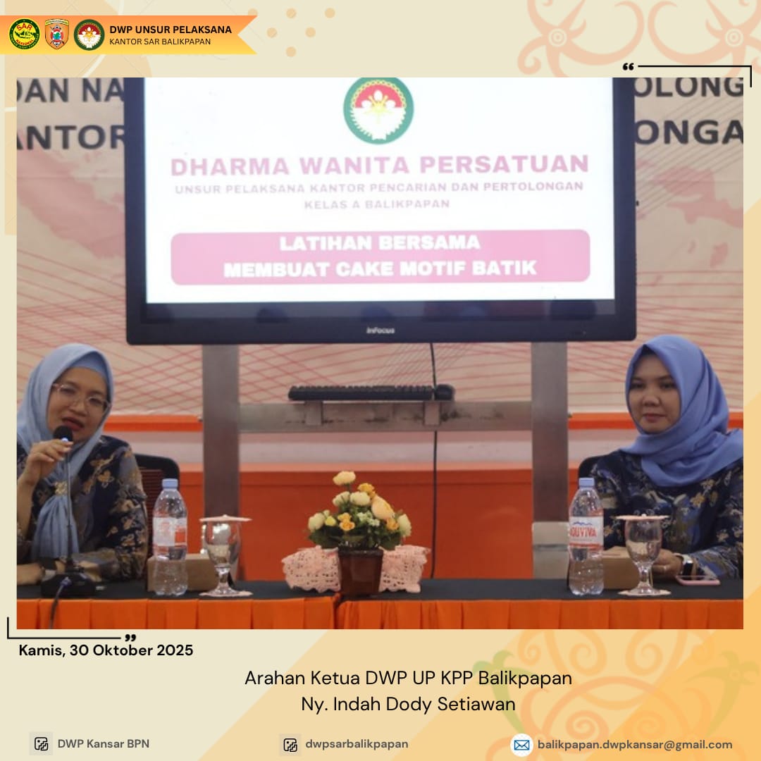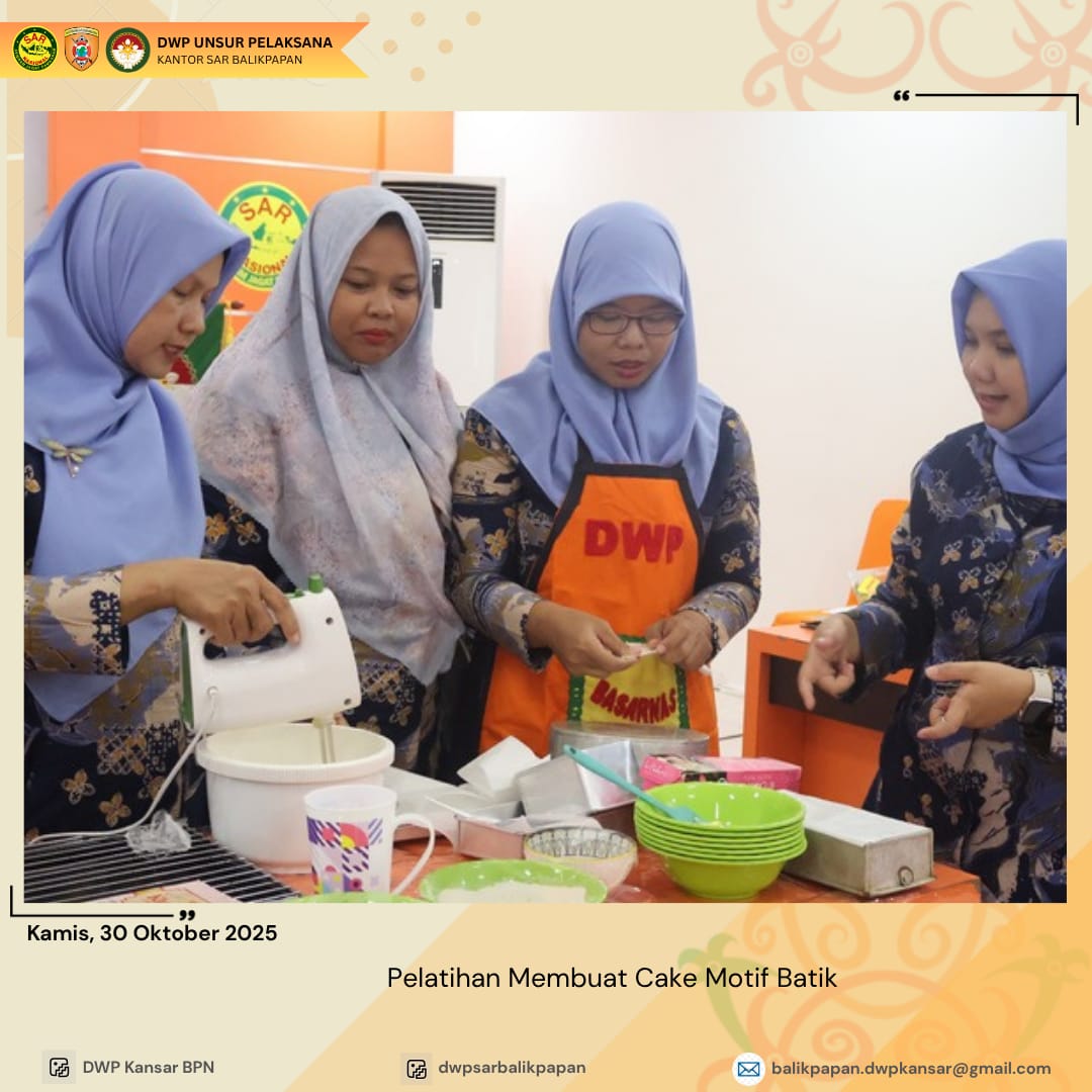 Kamis 30 Oktober 2025, Bidang Ekonomi DWP UP Kantor Pencarian dan Pertolongan Kelas A Balikpapan mengadakan kegiatan Pelatihan Membuat Kue Motif Batik. Kegiatan ini merupakan kegiatan sharing ilmu yang sebelumnya didapatkan dari DWP Kota Balikpapan dengan narasumber oleh Ny. Febriyani Nur Ngalim. Melalui kegiatan ini diharapkan dapat meningkatkan keterampilan anggota dalam bidang kuliner dan seni dekorasi, serta melestarikan budaya Indonesia melalui motif batik yang diaplikasikan pada cake.