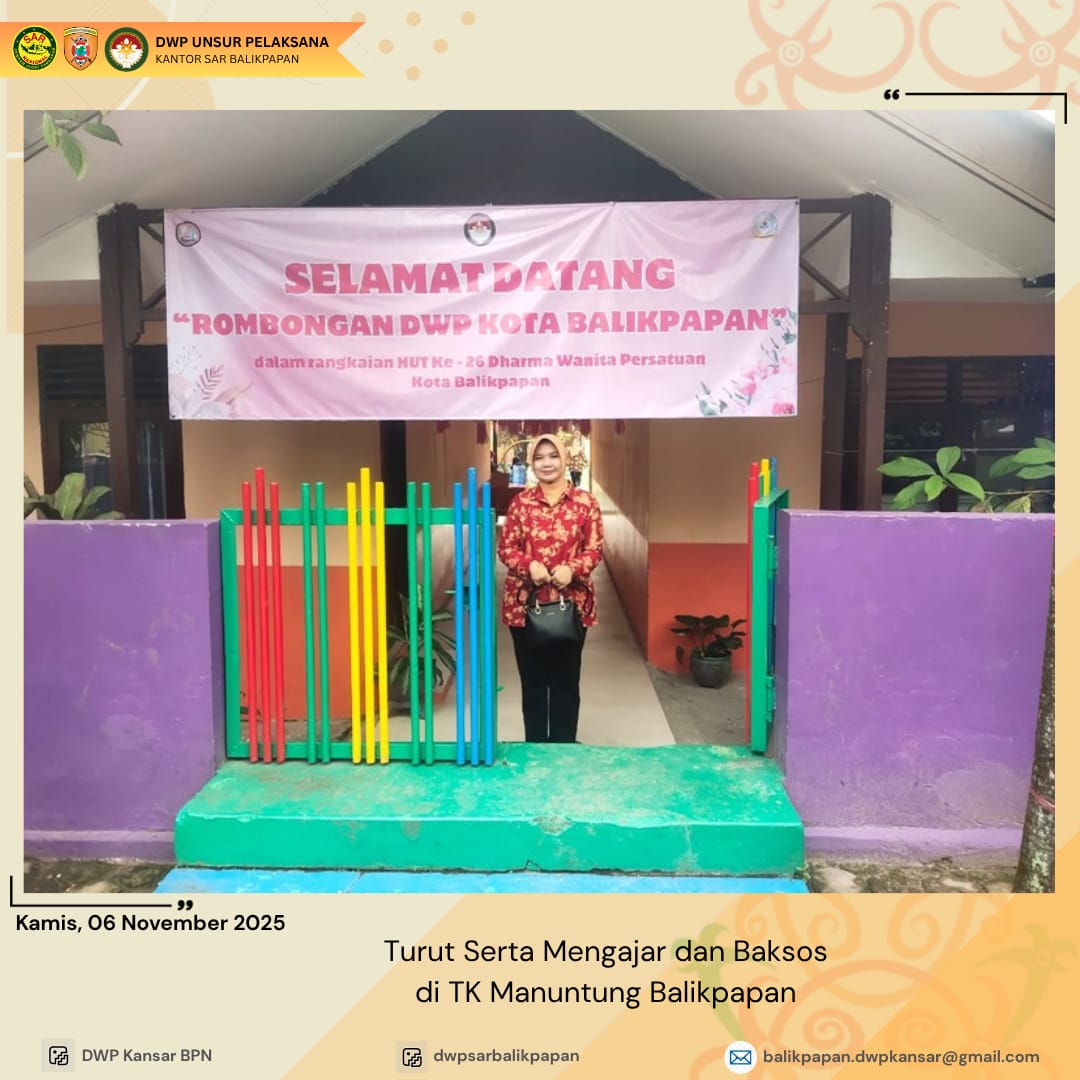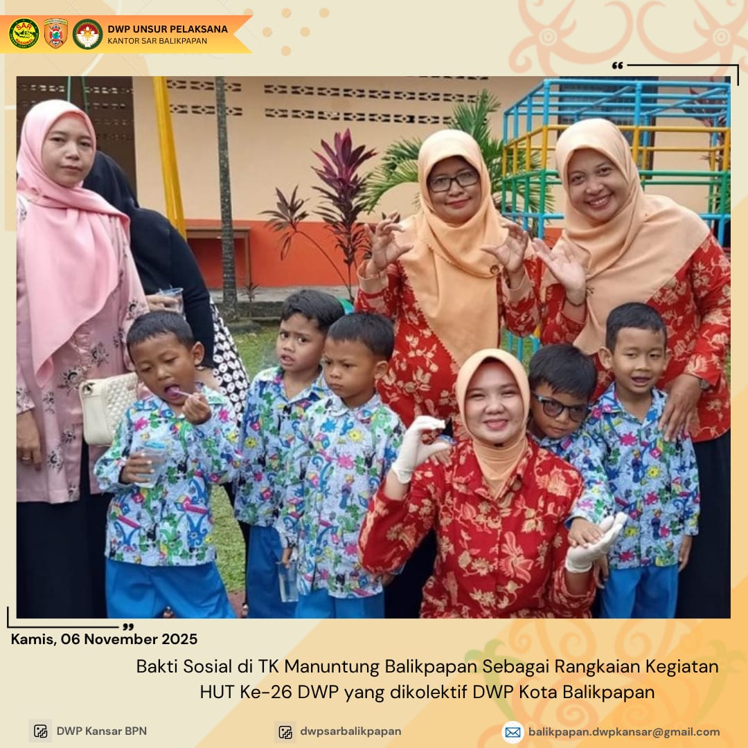 Kamis, 04 November 2025 DWP UP Kantor Pencarian dan Pertolongan Kelas A Balikpapan yang diwakili oleh Ny. Nety Anton Kurniawan dan Ny. Febriyani Nur Ngalim melaksanakan kegiatan Bakti Sosial di TK Manuntung Balikpapan yang dikolektif oleh DWP Kota Balikpapan sebagai rangkaian kegiatan HUT Ke-26 DWP. Dalam kegiatan ini, DWP UP KPP Balikpapan berpartisipasi dengan memberikan souvenir alat tulis dan perlengkapan sekolah kepada anak-anak TK Manuntung, serta turut mengajar dan berinteraksi dengan mereka. Kegiatan ini bertujuan untuk memberikan dukungan dan motivasi kepada anak-anak dalam proses belajar, serta mempererat hubungan antara DWP dengan masyarakat. Dengan adanya kegiatan ini, DWP UP KPP Balikpapan dapat berperan aktif dalam memberikan kontribusi positif bagi pendidikan dan kesejahteraan anak-anak di Balikpapan.