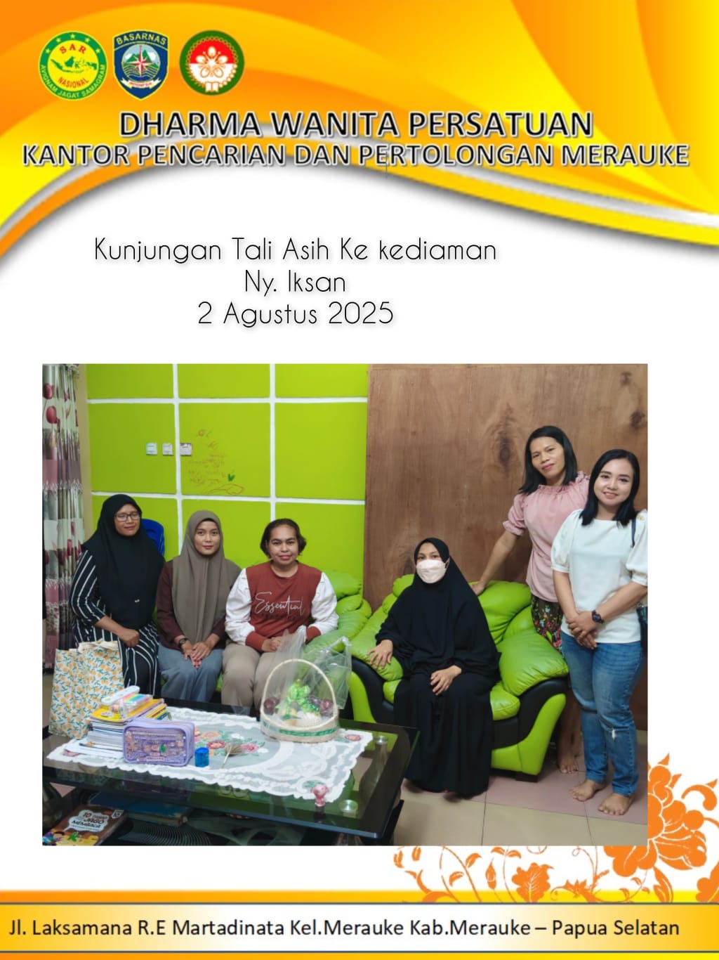 02/08/2025, DWP UP Kantor Pencarian dan Pertolongan Merauke mengadakan giat kunjungan kasih kepada Ny. Nurjanah Iksan yang sedang sakit, diikuti oleh 5 orang anggota.