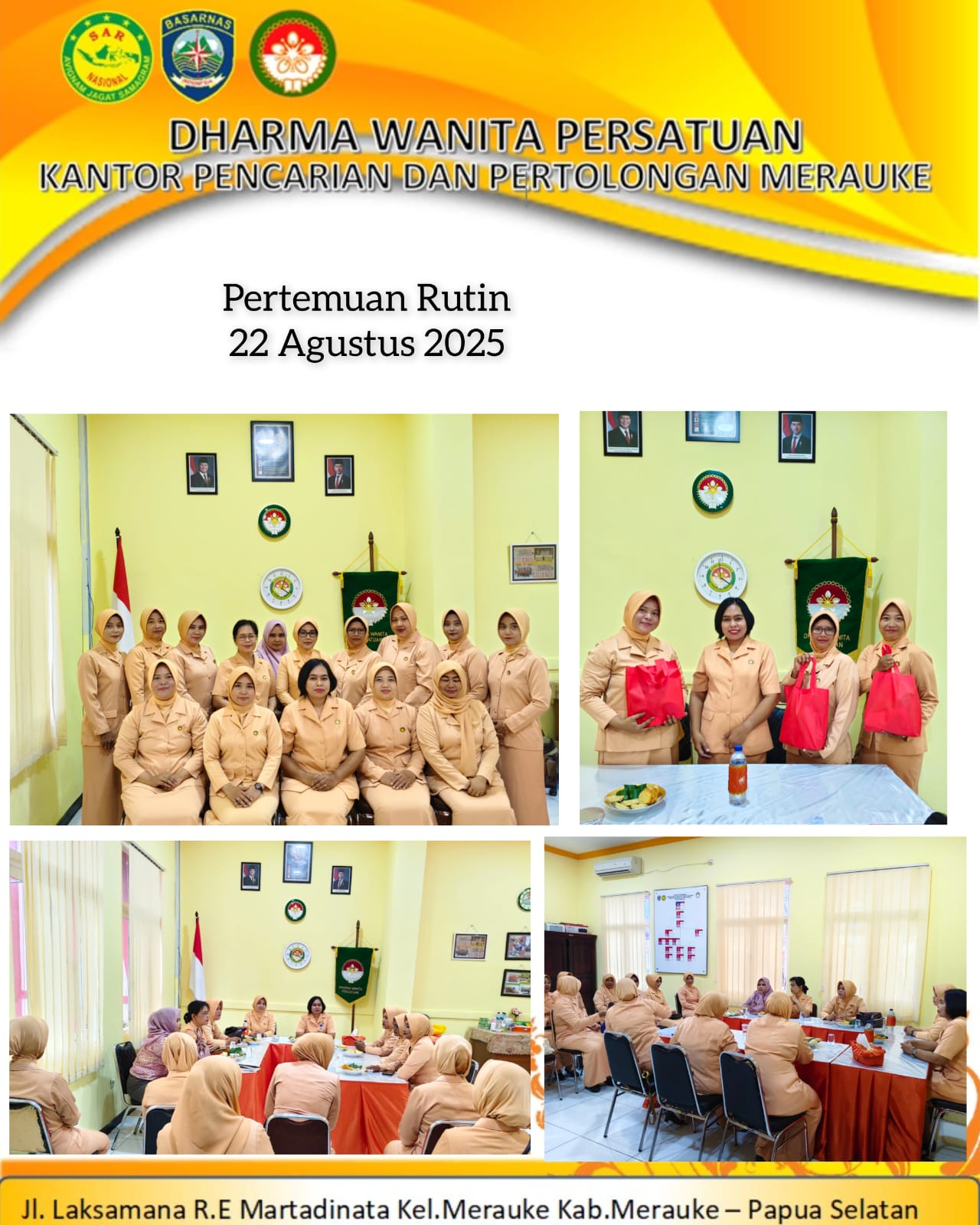 22/08/2025, DWP UP Kantor Pencarian dan Pertolongan Merauke mengadakan giat pertemuan rutin bulanan, bertempat di ruang sekretariat, diikuti oleh 15 orang anggota.