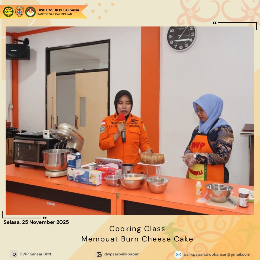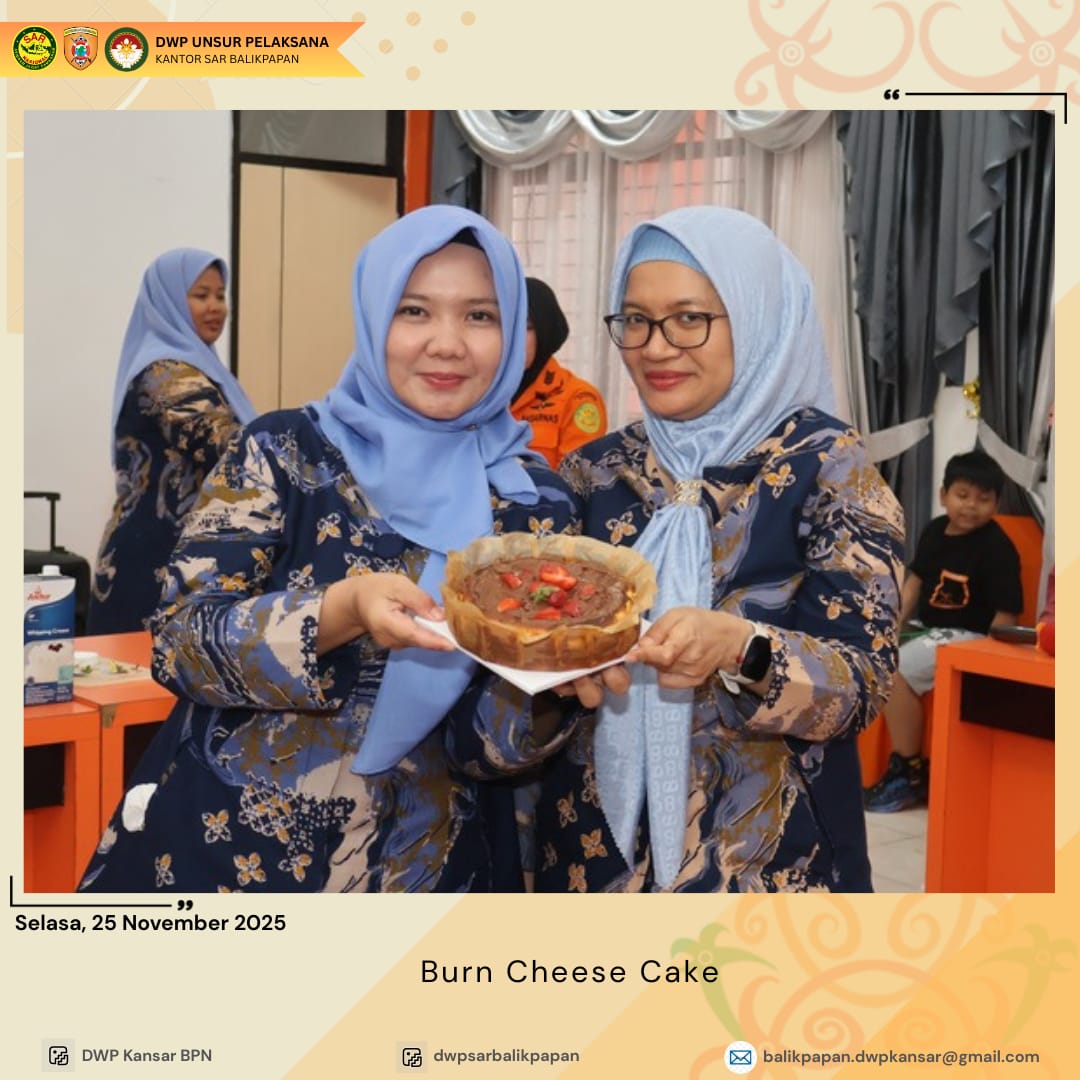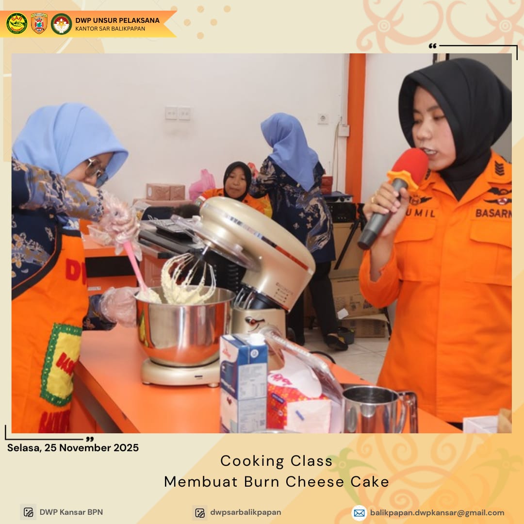 Selasa 25 November 2025, DWP UP Kantor Pencarian dan Pertolongan Balikpapan mengadakan pelatihan membuat burn cheese cake. Nn. Yaumil, anggota luar biasa DWP UP Kantor Pencarian dan Pertolongan Balikpapan membagikan resep dan teknik membuat burn cheese cake yang lezat kepada anggota DWP UP KPP Balikpapan. Dengan antusias, para peserta mengikuti setiap langkah yang dijelaskan oleh Nn. Yaumil, mulai dari menyiapkan bahan-bahan hingga memanggang cake yang sempurna. Suasana cooking class sangat hangat dan menyenangkan, dengan tawa dan obrolan yang tidak berhenti. Hasilnya, para peserta dapat membawa pulang Burn Cheese Cake yang lezat dan cantik, serta ilmu baru yang dapat dibagikan kepada keluarga dan teman-teman.