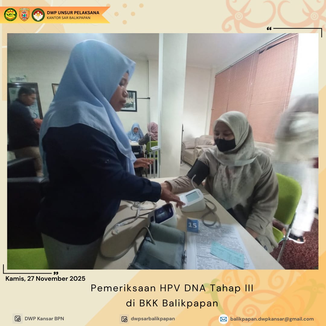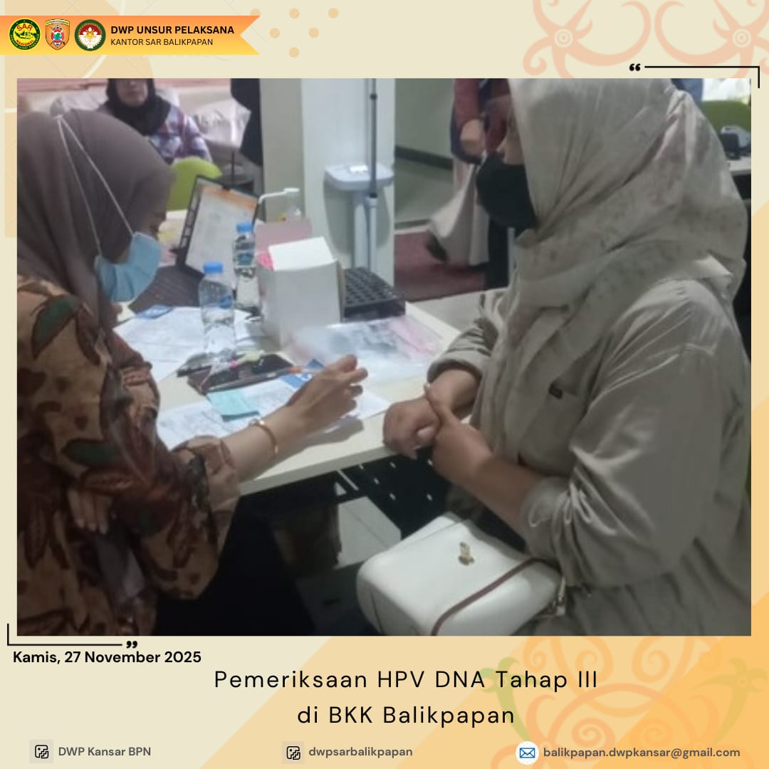 Kamis 27 November 2025, anggota DWP UP Kantor Pencarian dan Pertolongan Balikpapan mengikuti pemeriksaan HPV DNA tahap 3 yang diselenggarakan oleh BKK Balikpapan. Kegiatan ini merupakan bagian dari upaya pencegahan kanker serviks dan meningkatkan kesadaran akan pentingnya pemeriksaan kesehatan reproduksi wanita.Dengan adanya kegiatan ini, diharapkan dapat meningkatkan kualitas kesehatan dan kesejahteraan para wanita di lingkungan KPP Balikpapan.