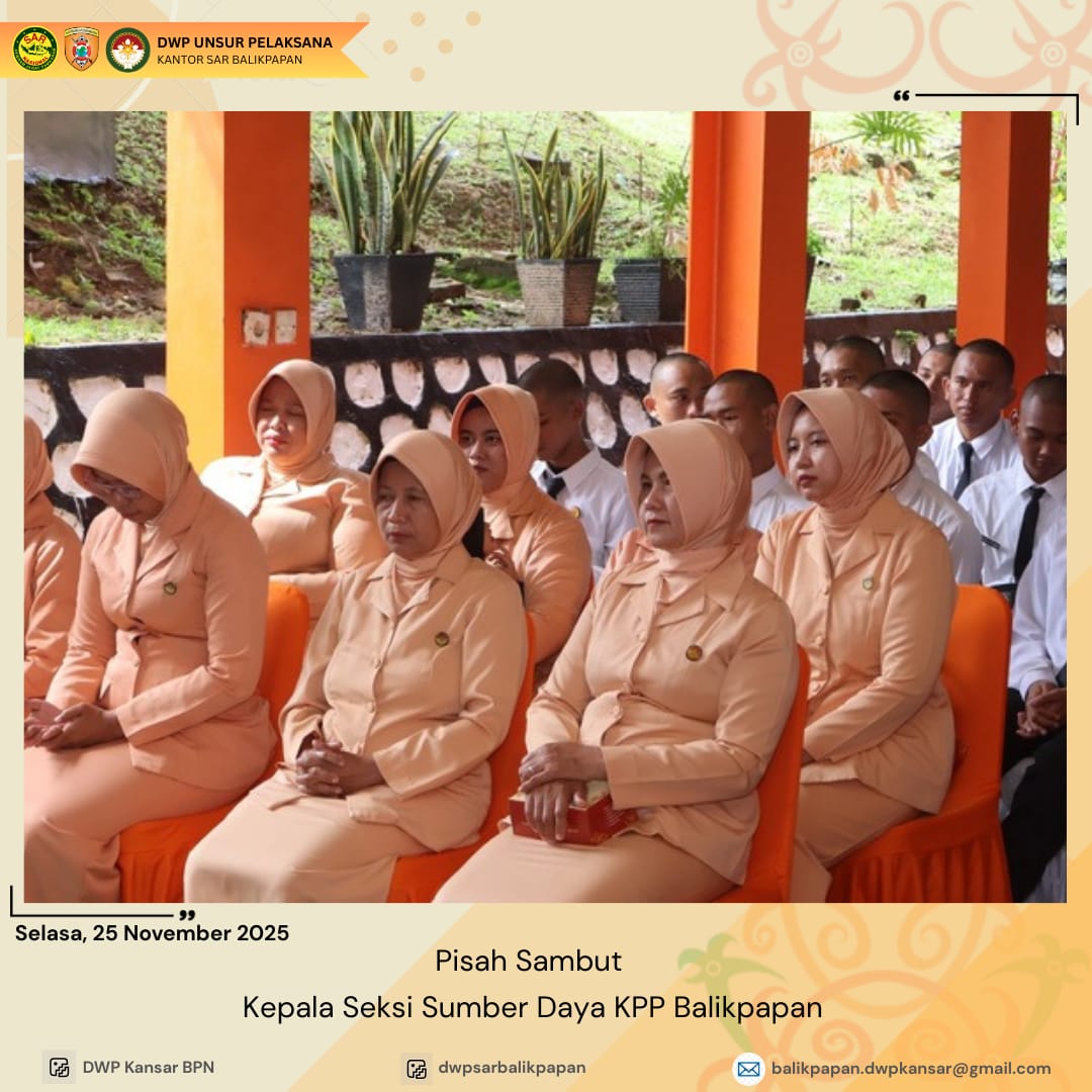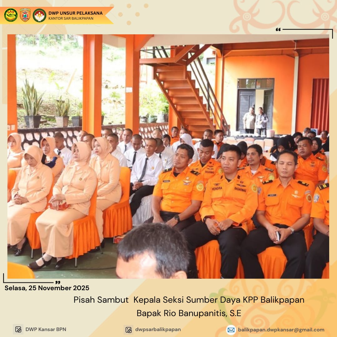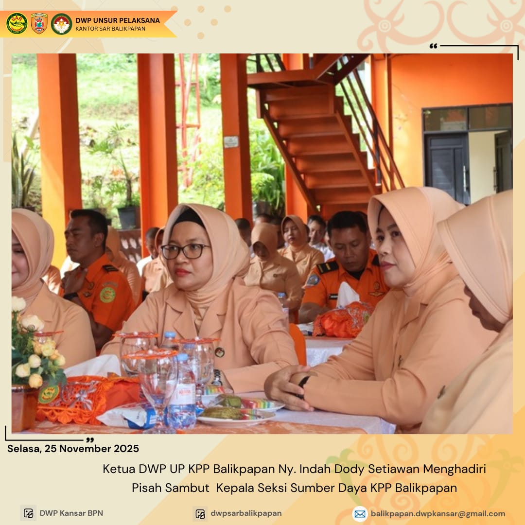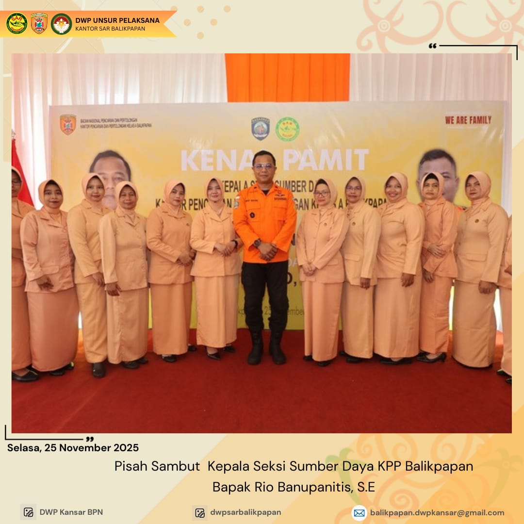 Selasa 25 November 2025, Ketua DWP UP Kantor Pencarian dan Pertolongan Balikpapan beserta anggota menghadiri acara Pisah Sambut Kepala Seksi Sumber Daya Kantor Pencarian dan Pertolongan Kelas ABalikpapan Bapak Rio Banupanitis, S.E kepada Bapak Wibowo, S.E. Ketua DWP UP KPP Balikpapan dan anggota memberikan ucapan terima kasih kepada Bapak Rio Banupanitis atas dedikasi dan pengabdiannya selama ini, serta menyambut Bapak Wibowo sebagai kepala seksi sumber daya yang baru beserta istri.