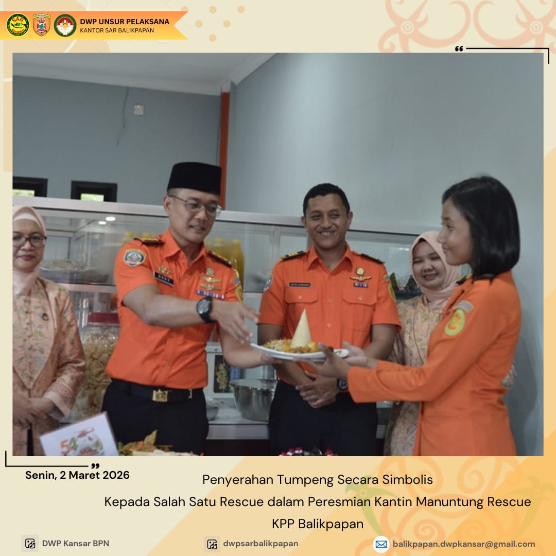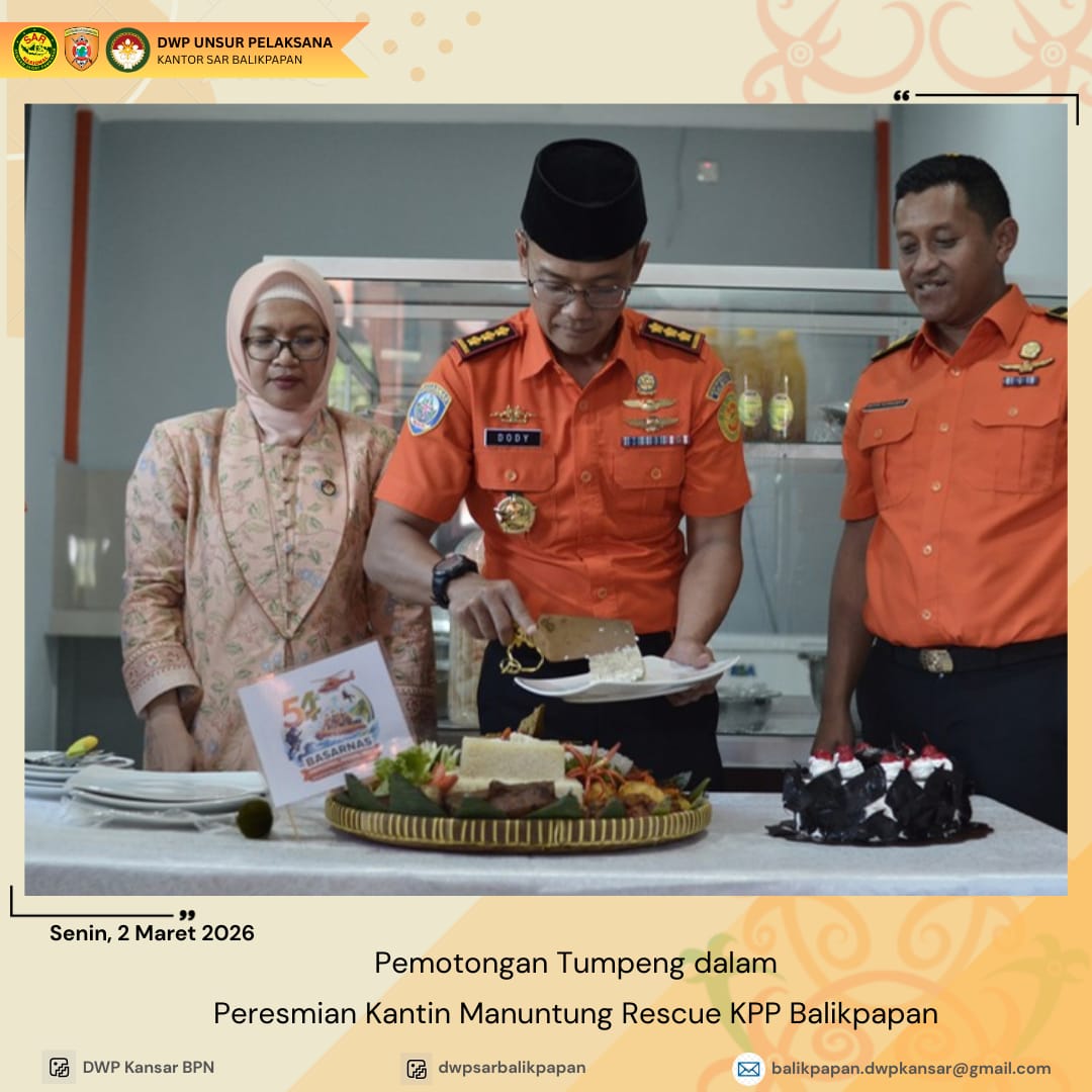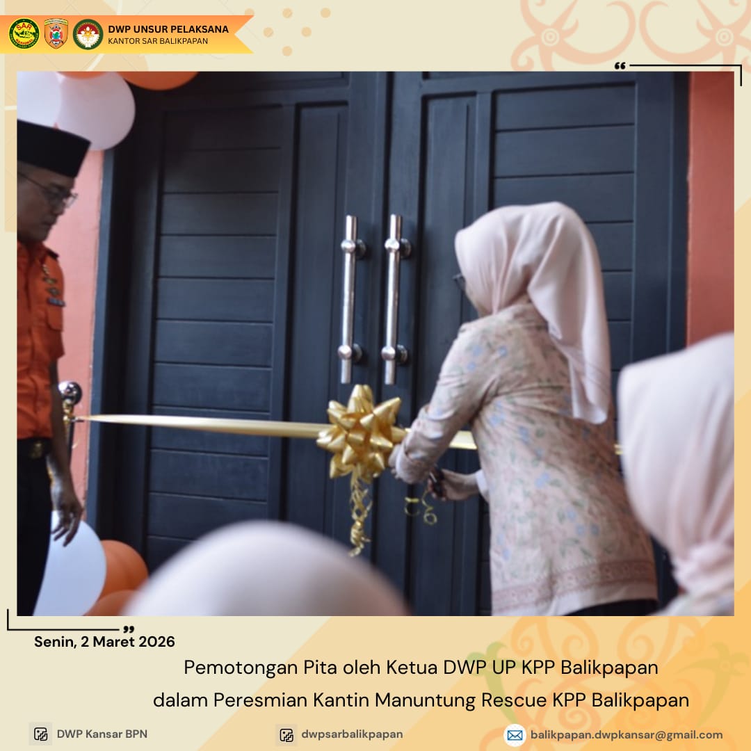 Senin 2 Maret 2026, Ketua DWP UP KPP Balikpapan Ny. Indah Dody Setiawan melakukan pemotongan pita dalam peresmian Kantin Manuntung Rescue di Kantor Pencarian dan Pertolongan Balikpapan. Peresmian didampingi oleh Penasehat DWP Bapak Dody Setiawan Suwondo. Peresmian Kantin Manuntung Rescue merupakan realisasi dari program kerja Bidang Ekonomi dalam rangka pemberdayaan ekonomi produktif anggota serta penyediaan fasilitas konsumsi yang sehat dan higienis di lingkungan kantor.