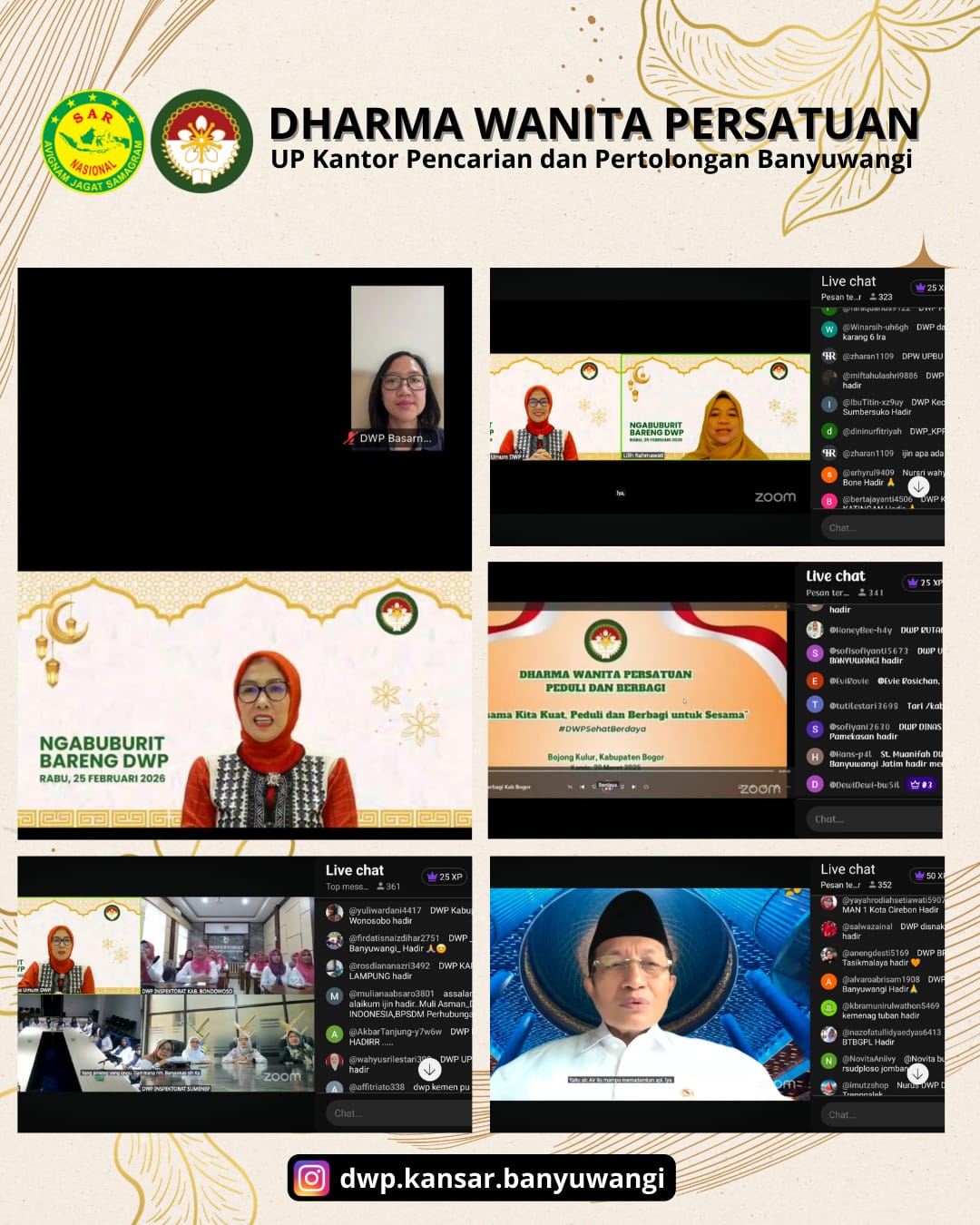 Hari Rabu, tanggal 4 Maret 2026/14 Ramadan 1447 H, pukul 15.45-17.30 WIB, mengikuti acara Ngabuburit Bareng DWP (Sesi 2) yang diselenggarakan oleh Dharma Wanita Persatuan Pusat, yaitu Kajian Ramadhan bersama Menteri Agama RI (Imam Besar Masjid Istiqlal Jakarta) - Bpk. Prof. Dr. KH. Nasaruddin Umar, MA dan sambutan dari Ketua Umum Dharma Wanita Persatuan - Ibu Ida Rachmawati Budi G Sadikin, yang dilaksanakan secara virtual melalui aplikasi Zoom dan Live Streaming Youtube