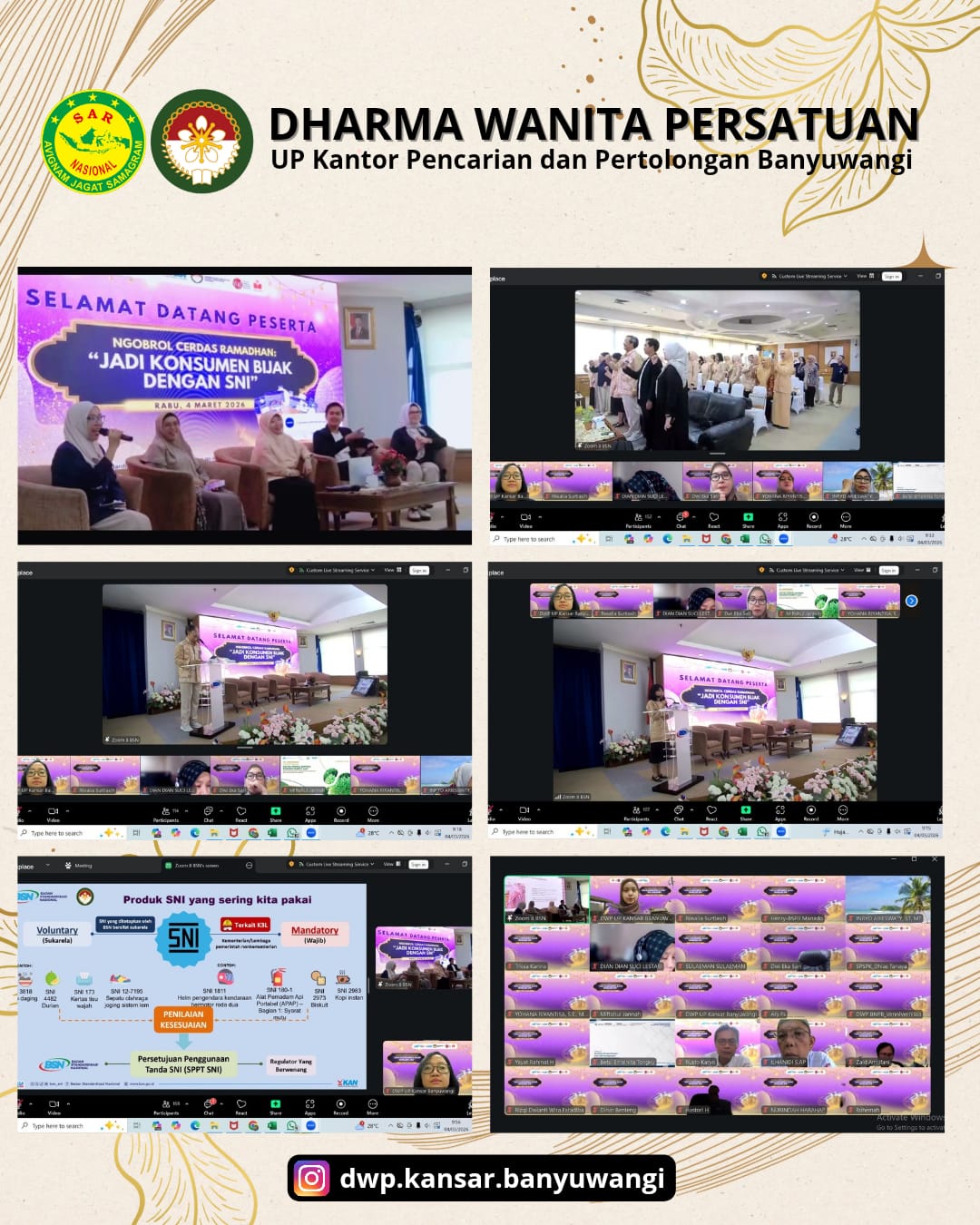 Hari Rabu, tanggal 4 Maret 2026, pukul 09.00-12.00 WIB, secara hybrid melalui Aplikasi Zoom telah diikuti kegiatan Talkshow Ngobrol Cerdas Ramadhan dengan tema Jadi Konsumen Bijak dengan SNI yang dilaksanakan oleh Dharma Wanita Persatuan Badan Standarisasi Nasional. Dalam talkshow tersebut diberikan edukasi dan informasi tentang SNI bukan hanya formalitas untuk suatu produk, tetapi suatu bentuk perlindungan nyata bagi konsumen. Dan juga tentang DWP sebagai salah satu Duta Konsumen Cerdas yang memiliki peran strategis dalam edukasi SNI dan perlindungan konsumen. Output mengikuti kegiatan ini juga seluruh peserta diberikan Sertifikat keikutsertaan yang diberikan oleh Direktur Penguatan Penerapan Standar dan Penilaian Kesesuaian Badan Standarisasi Nasional