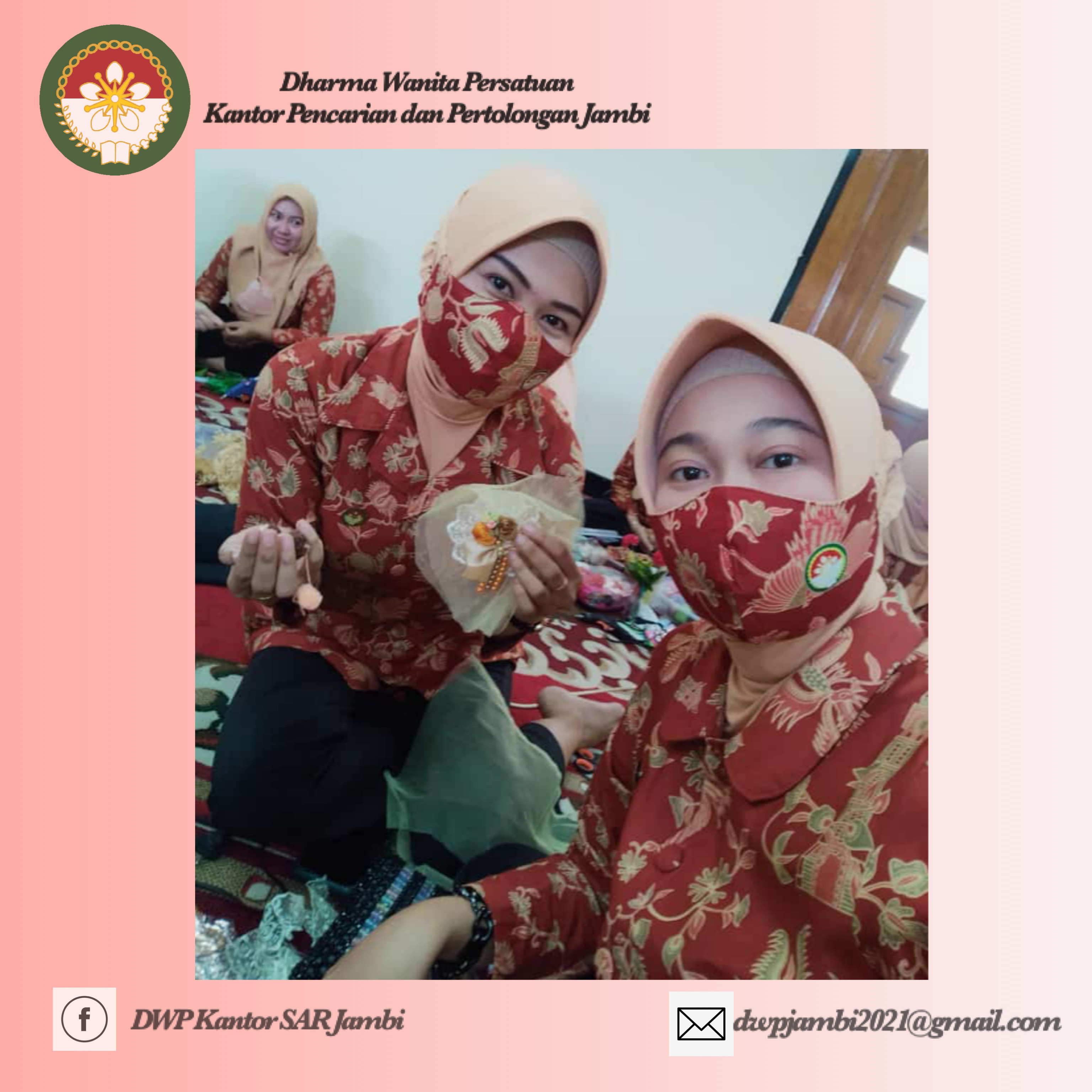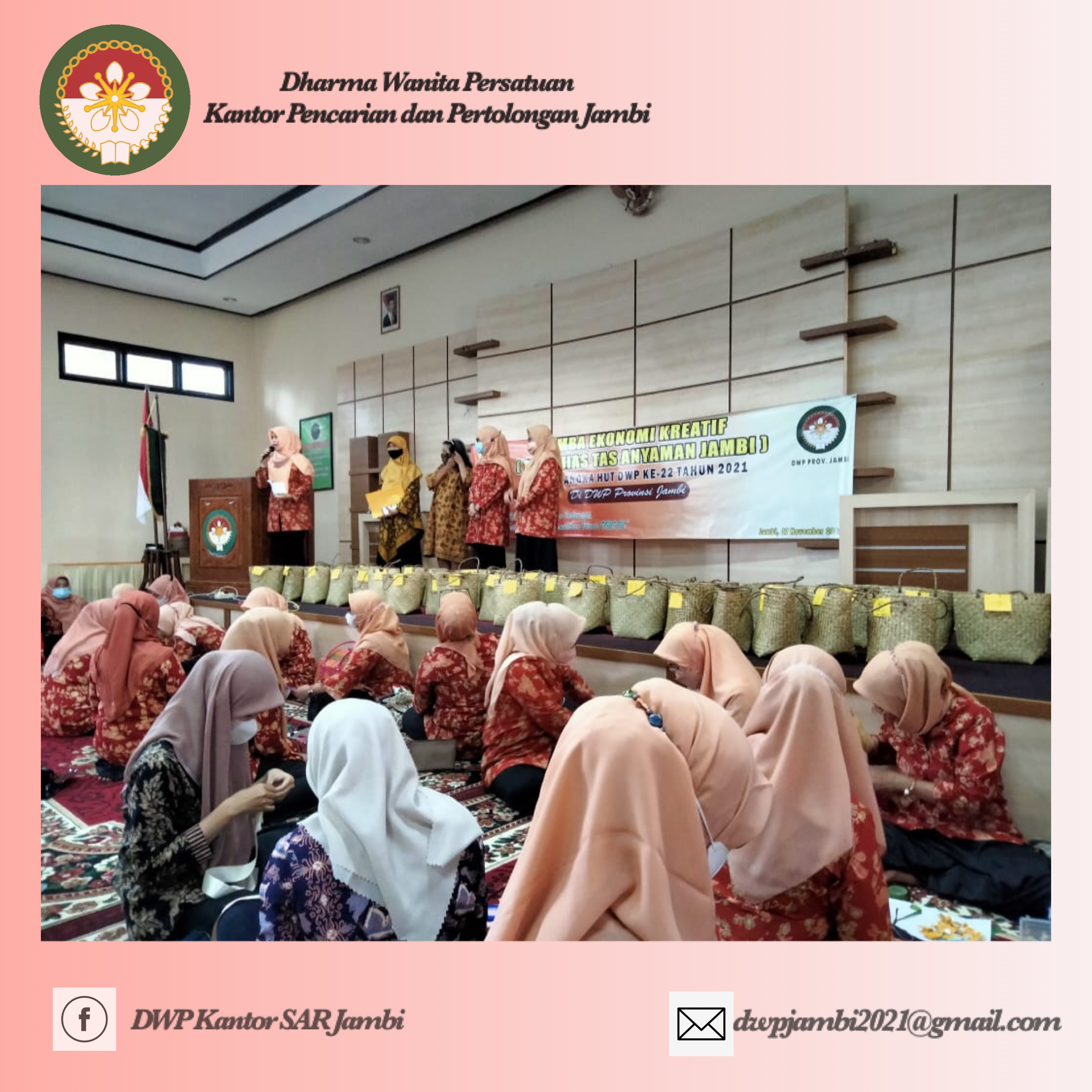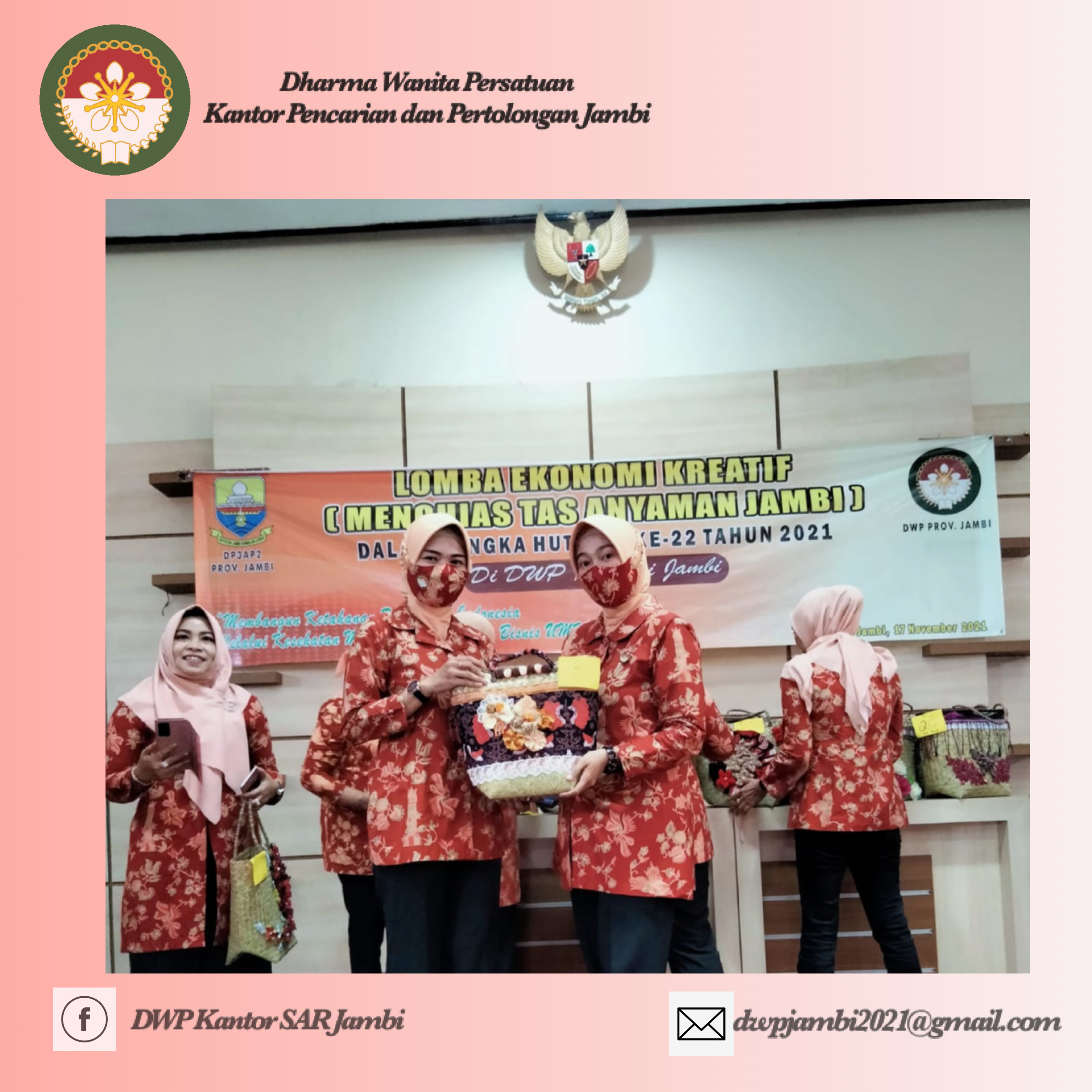 Rabu, 17 November 2021. Ny. Lidya & Ny. Sandra mengikuti kegiatan yang diadakan oleh Dharma Wanita Persatuan Prov. Jambi yaitu lomba ekonomi kreatif dengan menghias tas kerajinan anyaman Jambi dalam rangka memperingati HUT Dharma Wanita Persatuan yang ke-22 tahun 2021 yang dilaksanakan di gedung aula DWP Prov. Jambi.