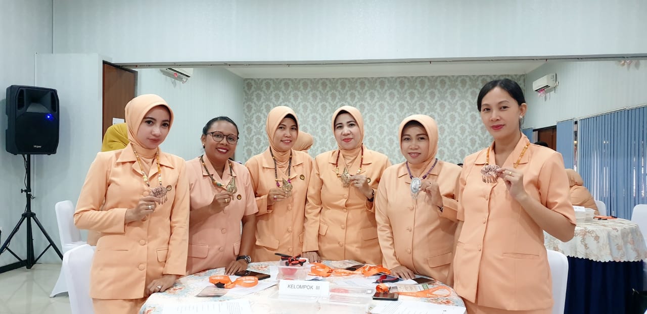 Ketua Dharma Wanita Persatuan Kantor Pencarian dan pertolongan jambi mengikuti kegiatan merangkai kalung yang diadakan di LKP Rumah Kahyana. diikuti oleh 1 orang.