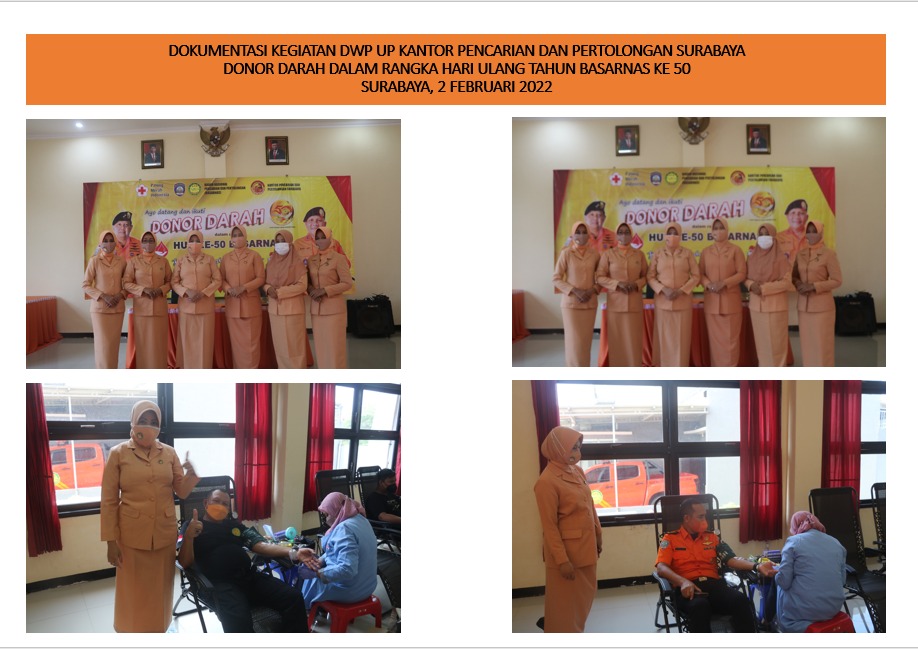 Pada tanggal 2 Februari 2022, mengikuti kegiatan Donor Darah dalam rangka peringatan HUT Ke-50 tahun Badan Nasional Pencarian dan Pertolongan, yang dilaksanakan di Mess Basarnas Kwangsan Sidoarjo, diikuti oleh ketua dan pengurus DWP UP Kantor Pencarian dan Pertolongan Kelas A Surabaya sebanyak 6 orang