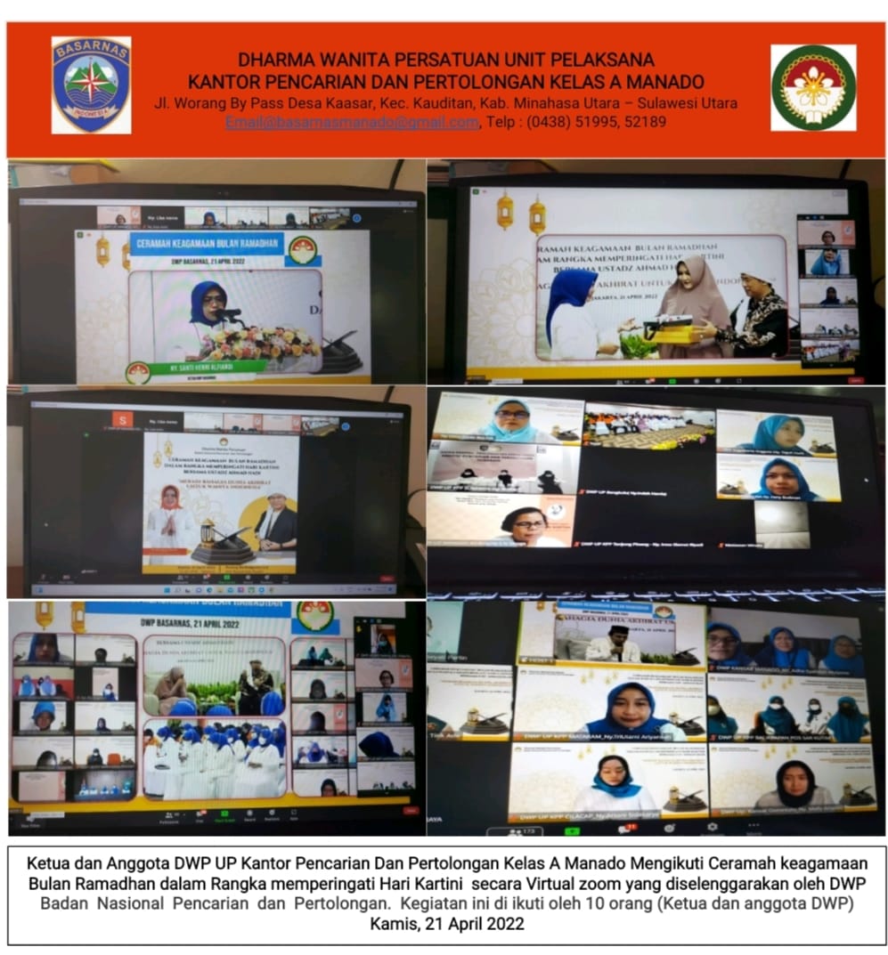 Ketua dan Anggota DWP UP Kantor Pencarian Dan Pertolongan Kelas A Manado Mengikuti Ceramah keagamaan Bulan Ramadhan dalam Rangka memperingati Hari Kartini secara Virtual zoom yang diselenggarakan oleh DWP Badan Nasional Pencarian dan Pertolongan. Kegiatan ini di ikuti oleh 10 orang (Ketua dan anggota DWP) Kamis, 21 April 2022