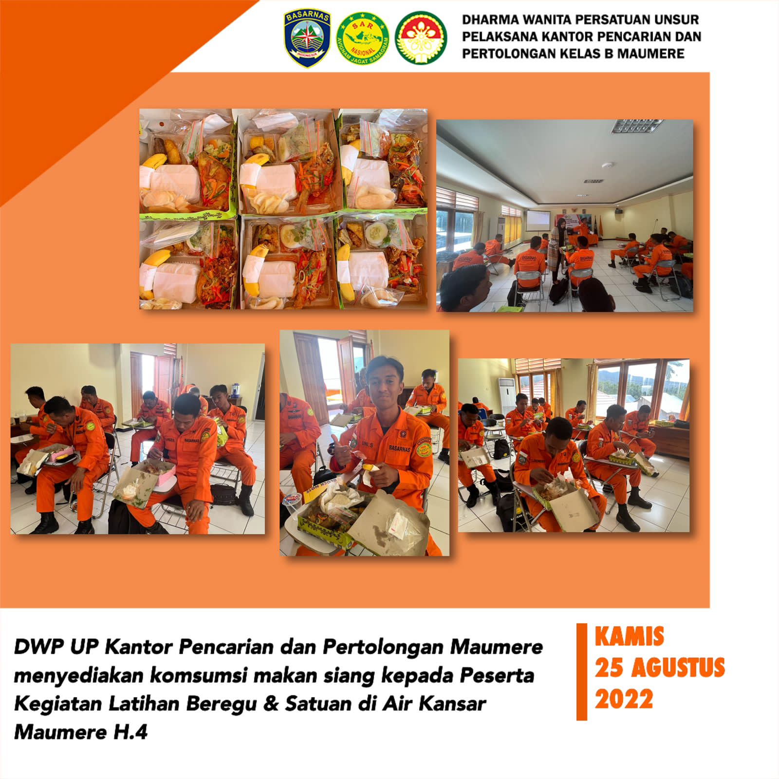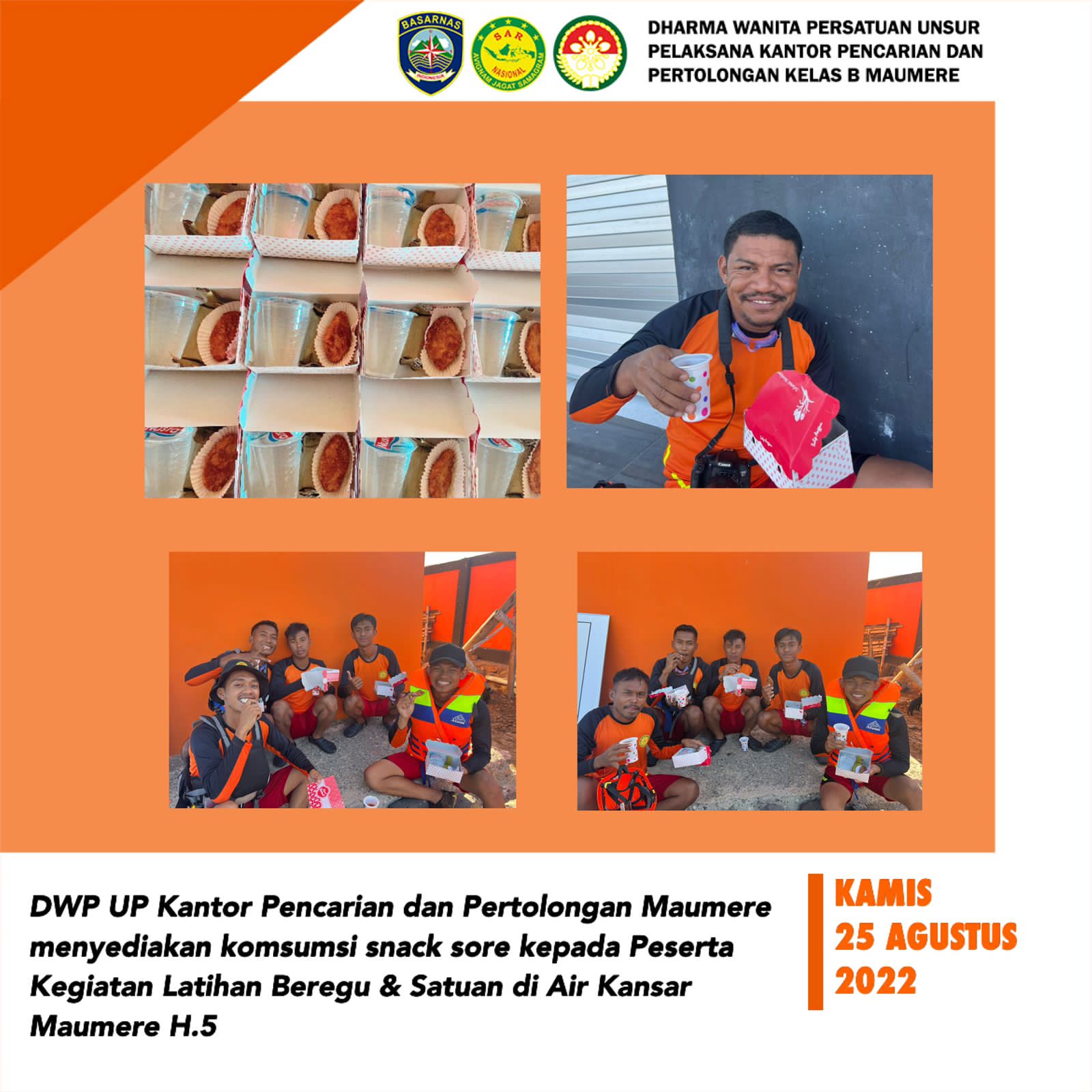 Kamis, 25 Agustus 2022. Anggota DWP UP Kantor Pencarian dan Pertolongan Maumere menyediakan komsumsi snack pagi kepada Peserta Kegiatan Latihan Beregu & Satuan di Air Kansar Maumere H.4